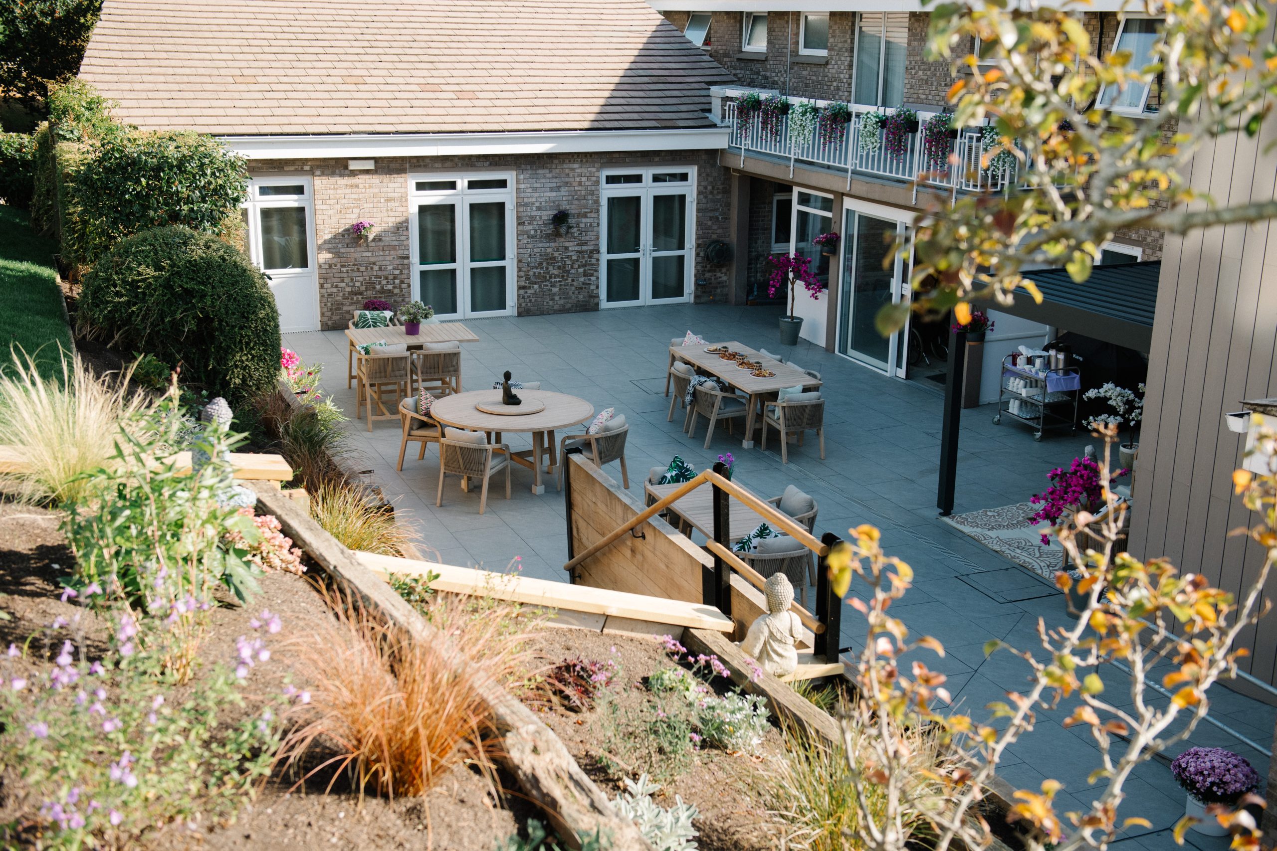 Key features include shaded seating areas with new furniture, a pergola with heating and lighting for year-round use, and raised planters designed to encourage residents to take part in gardening and outdoor hobbies.