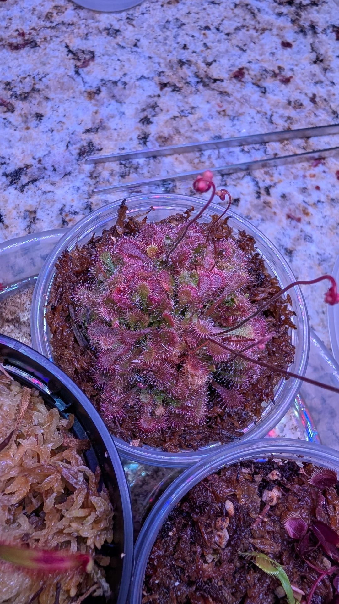 Picked up this little Drosera at while back from a local nursery, it was outside not getting a lot of light and was all green. It is under a 48w led grow light now getting somewhere around 300 PPFD. I understand that red is good but is this too much, just don't want to burn it up. There is plenty of dew on it and it's growing flowers like crazy.