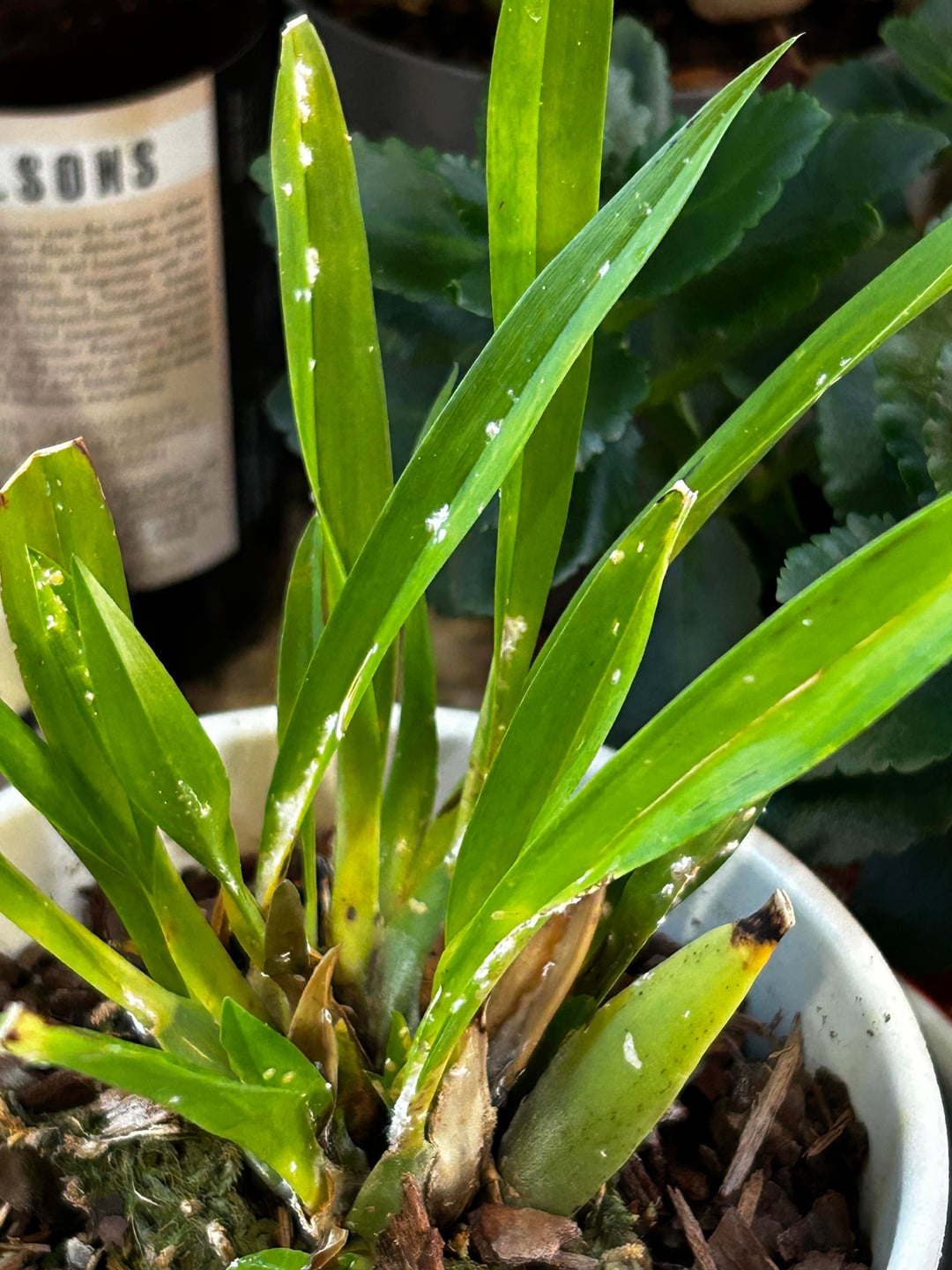 The worst thing about your plant is what looks like inappropriate watering [technique and timing]. There is rot setting in and it doesn’t look like the pseudobulbs are developing as typical.