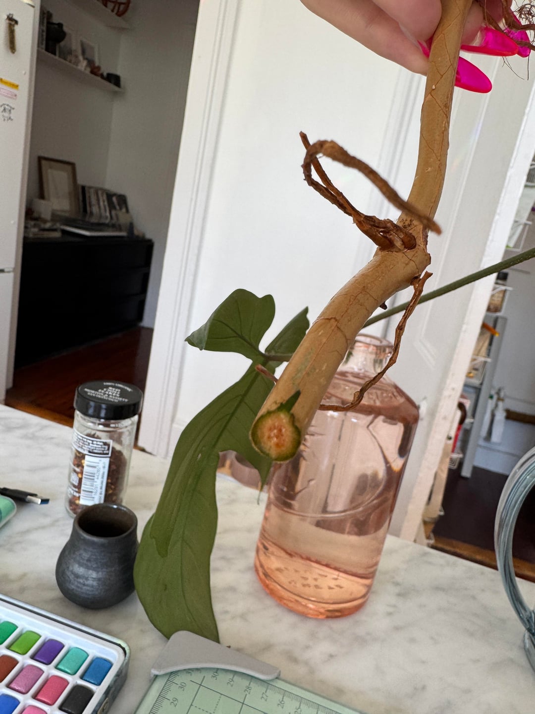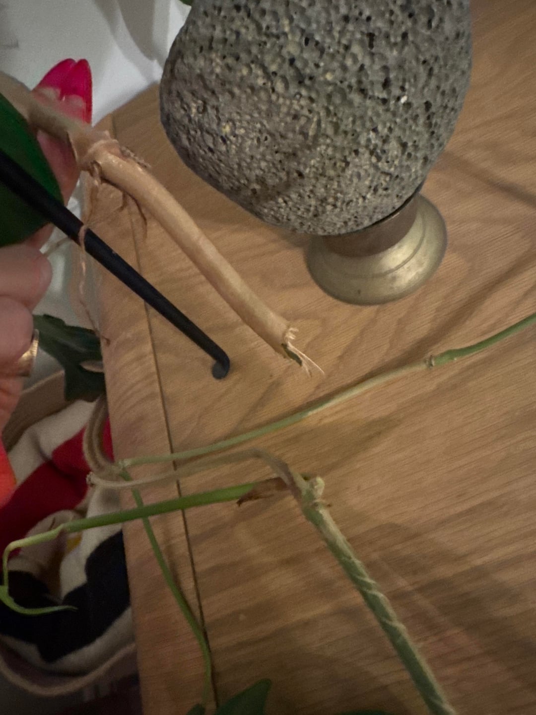 I came home last night to this very sad situation and I figured I can propagate the vine where it broke, but it’s kind of odd because the stem itself seems kind of wood/stick like. I put it in water, but I’m not sure if it’s healthy enough where I cut it or if I need to cut somewhere else? I appreciate everyone’s help!