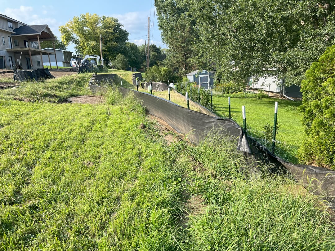 Improperly installed silt fence. Silt fence fabric has to be buried 6-8″ below grade and backfilled on top of the fabric to ensure nothing runs underneath it. You also have to design for water in heavy rain conditions to escape without blowing out the fence. It’s actually not easy to do by hand – typically done with a skid-steer digging the trench and backfilling.