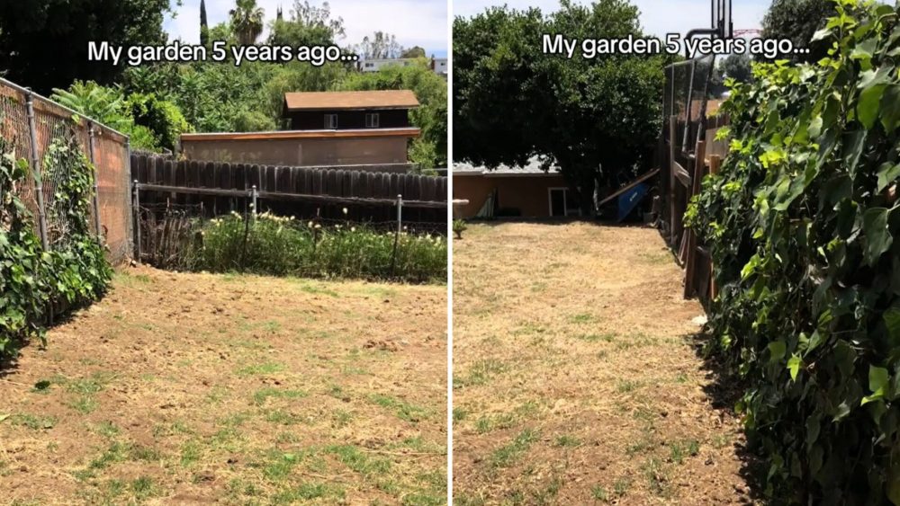 In the video, Weithorn pans over a wide backyard that is entirely covered in patchy grass. The lawn has gone almost completely yellow, with only a few clumps of struggling green. “My garden five years ago,” says the caption.