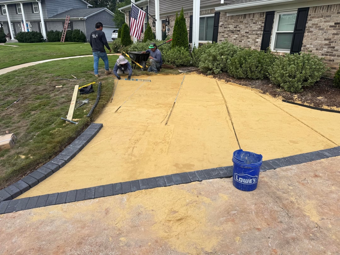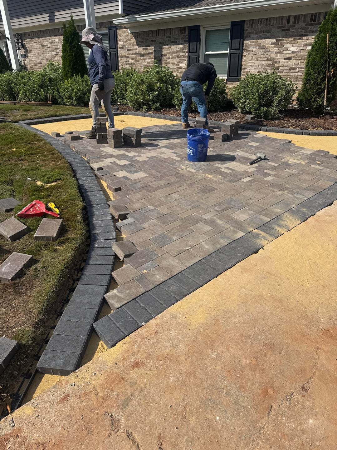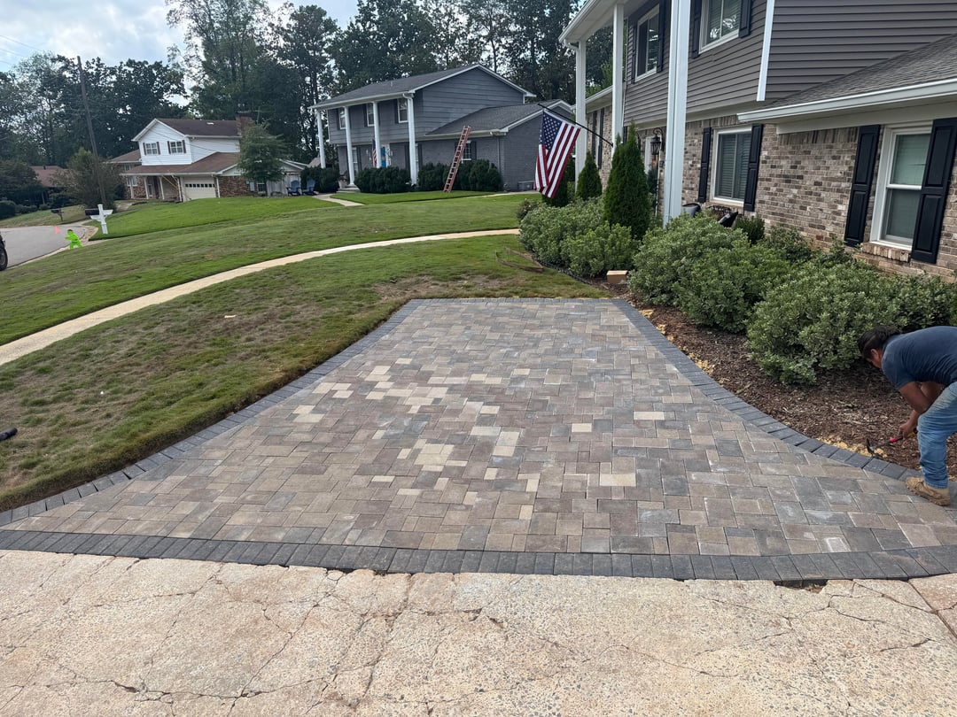 I took this picture before poly sand, final tamp and before we repaired the chunks of driveway we removed to prevent a tripping hazard. Not sure why some of the pavers appear lighter than the others. In person it’s all the same. I was happy with the way it turned out. Several months ago I lost my hardscape crew. This is my new crews third patio/parking pad.