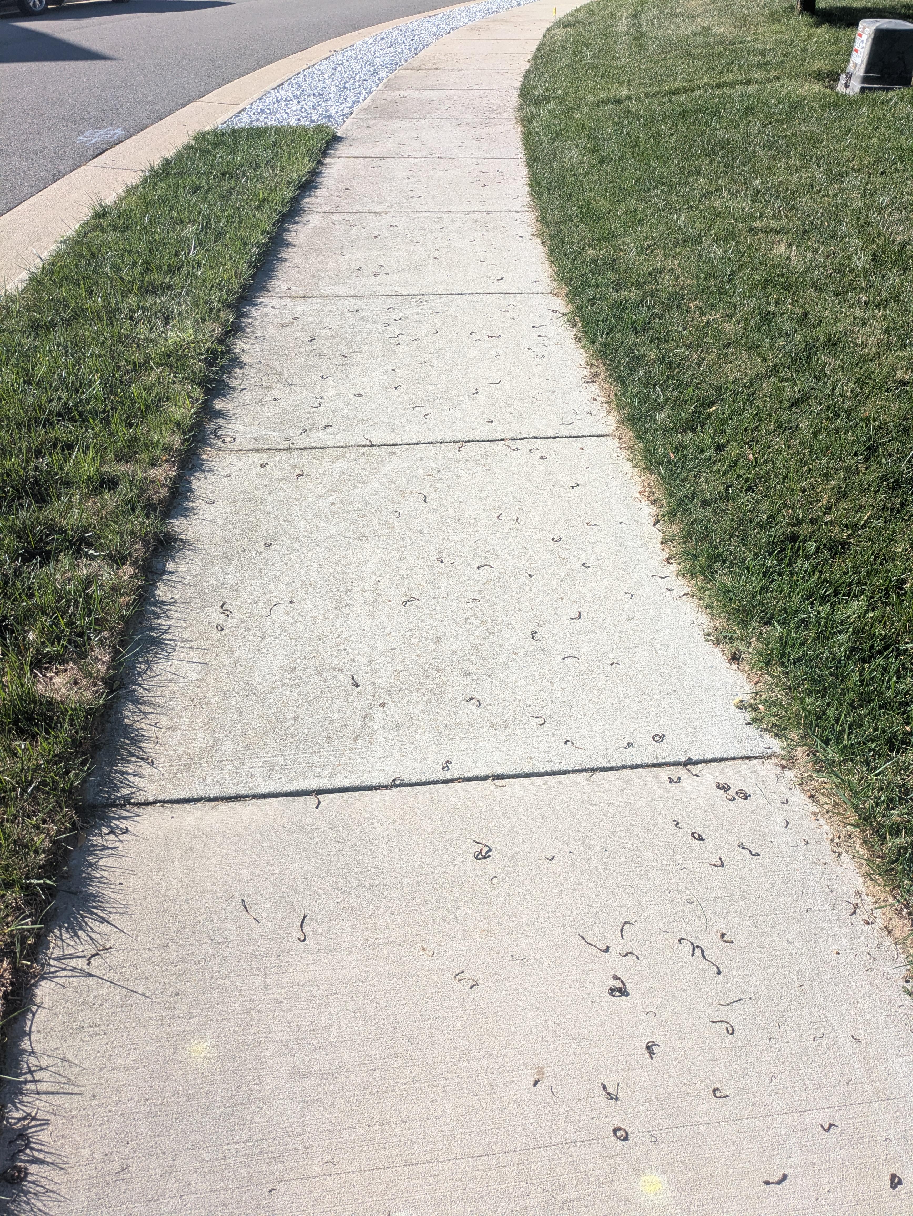 This happens after a rain. Rain goes into the soil, basically drowning the worms/pushing them up cuz the water is filling in all the empty space in the soil. Then they get washed out to the sidewalk or pavement and get cooked when the sun comes out. The other parts of the sidewalk dont have any maybe due to not having as many worms in the ground. Maybe the house owner cleaned them up. Maybe the soil in those other areas had more voids in it for the water to fill keeping the worms in the lawn