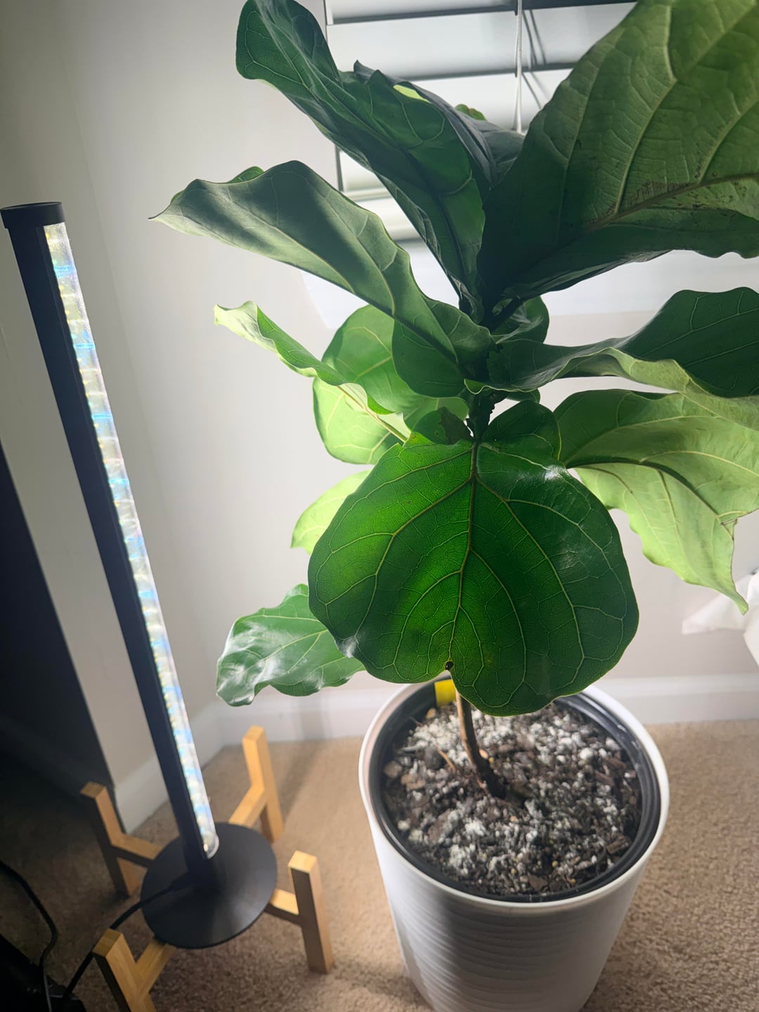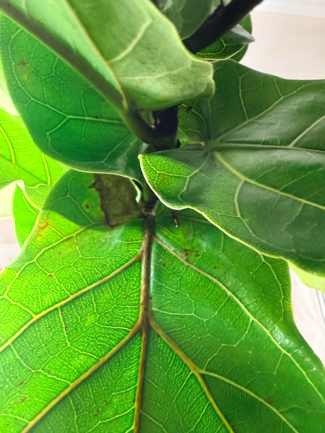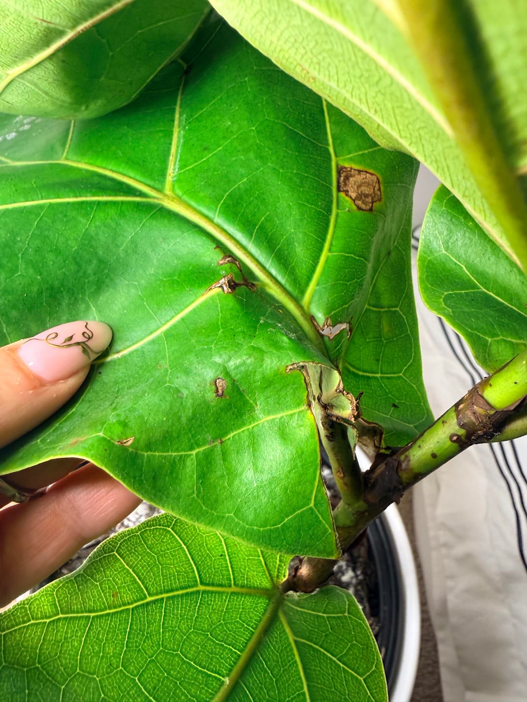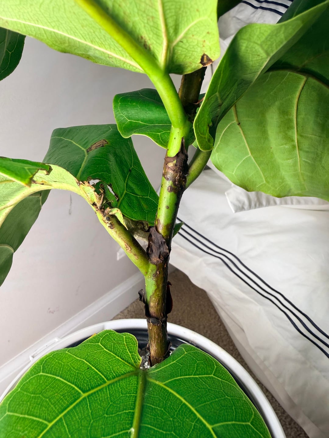 My husband brought her home from Menards as a surprise. I knew they could be tough to care for so I didn’t repot and tried to give her enough light and not over water, but she is clearly NOT happy. Please help! Any idea why the stem looks black and the leaves have brown spots and what I can do to save her?