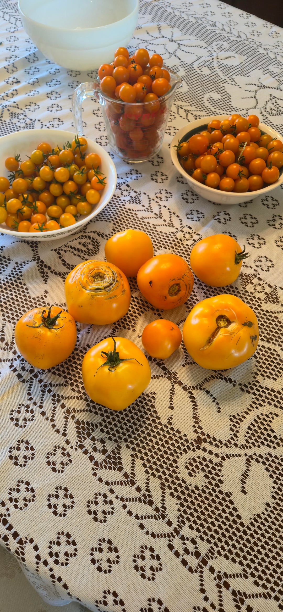 Cherry tomatoes and yellow jubilee. Any idea on what to make with it all? I've already made tomato salsa and it turned out awesome. I'm not a huge fan of jam personally. I want to try dehydrating them but not sure how. Does anyone have any other ideas on what to do, for instance, pasta sauce?