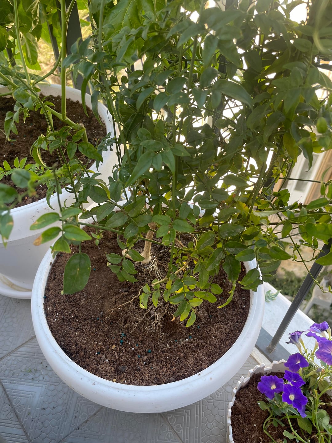 I have a climbing jasmine in a pot, and I noticed some new shoots coming up from the soil near the roots. But the leaves don’t look like jasmine at all. What does this mean? Are these really from the jasmine, or something else?