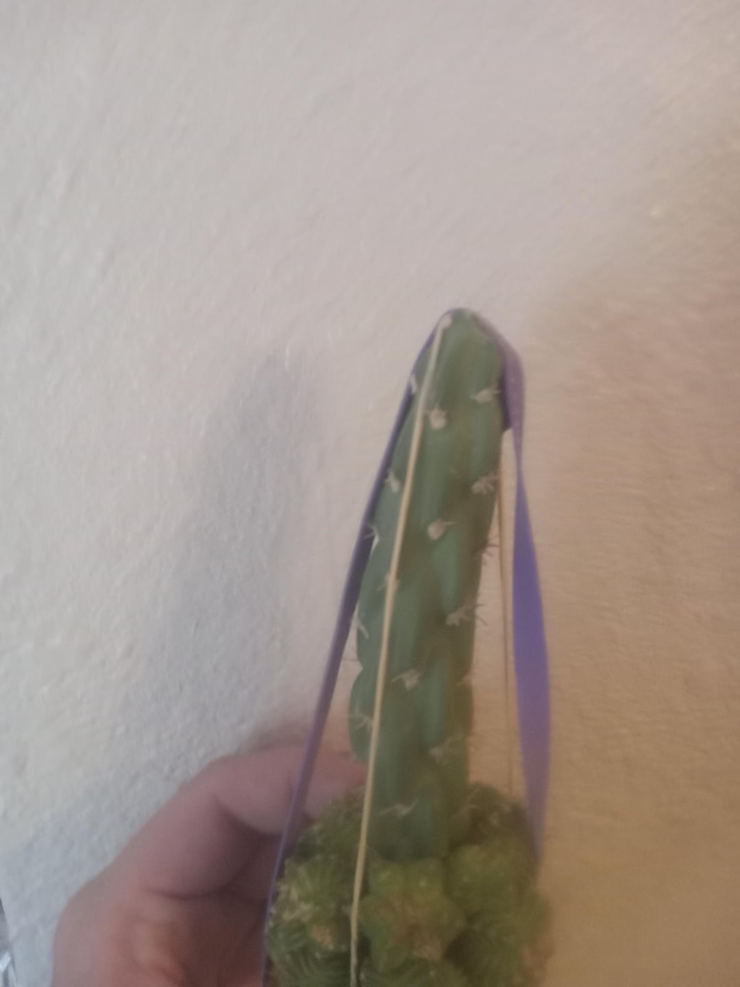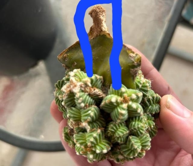So I have this beautiful aztekium graft and the hylocerus stock rotted, so I cut all the hylo flesh off and left the fresh vascular stem not affected by the rot, slit the vascular stem a few times (so multiple grow points can possibly connect) Then stab grafted it onto a clyindropuntia.