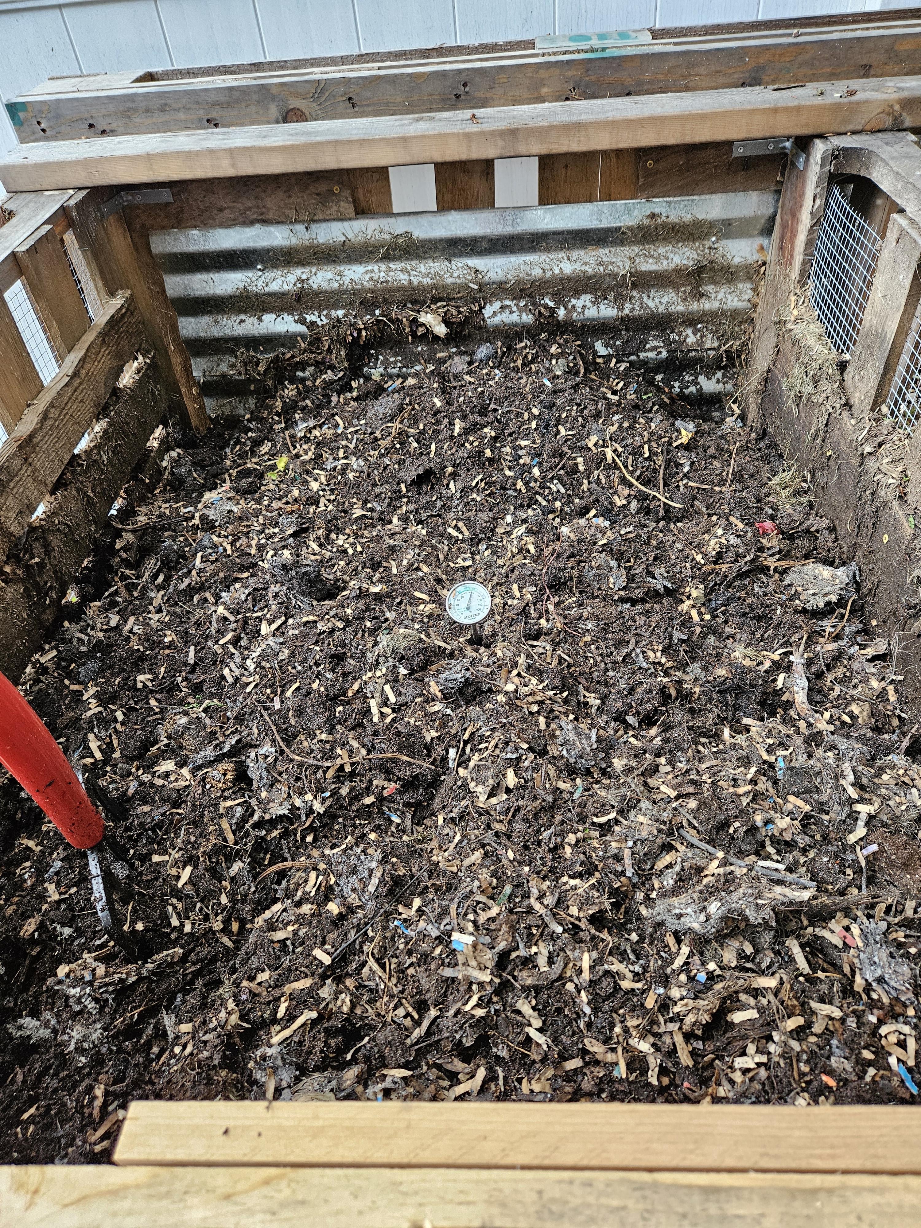 This pile has been sitting for almost six weeks untouched. I had it covered with a tarp. I peeked under and decided to just turn the top nine inches. Very surprised to see coffee and shredded cardboard very visible and discernible. No bad smell. Big activity present. Moist to the touch.