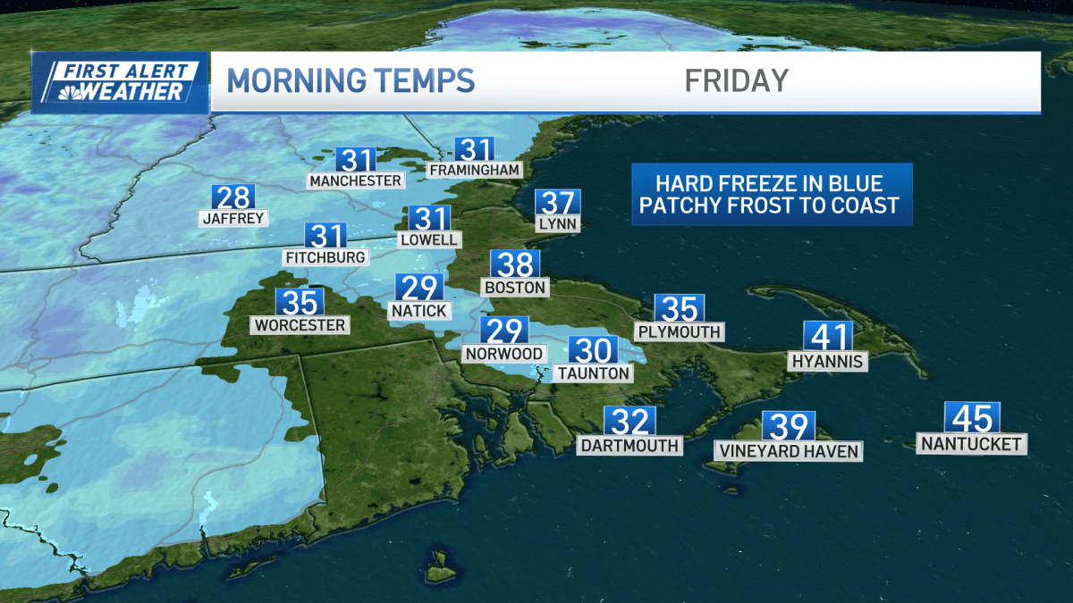Our coldest morning in southern New England this season will be Friday, with lows in the 20s to 30s. This means an end to the growing season will be likely inland, and patchy frost at the coast — time to bring in the last of the summer crops, potted tropical flowers or plants, or cover any flowering bushes you want to save.