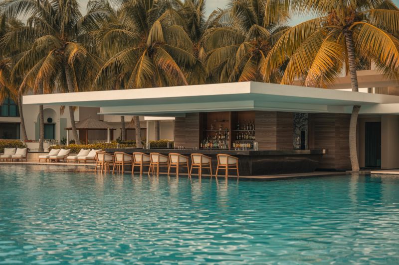 When guests are ready to enjoy a refreshing drink, they can paddle right up to the swim-up bar. A variety of cocktails, snacks like shrimp ceviche, sandwiches, and wraps are available, offering the perfect poolside experience. The swim-up bar is designed to be a social hub, where guests can mingle, unwind, and enjoy the sights of the hotel’s beautiful garden courtyard while sipping on signature drinks.