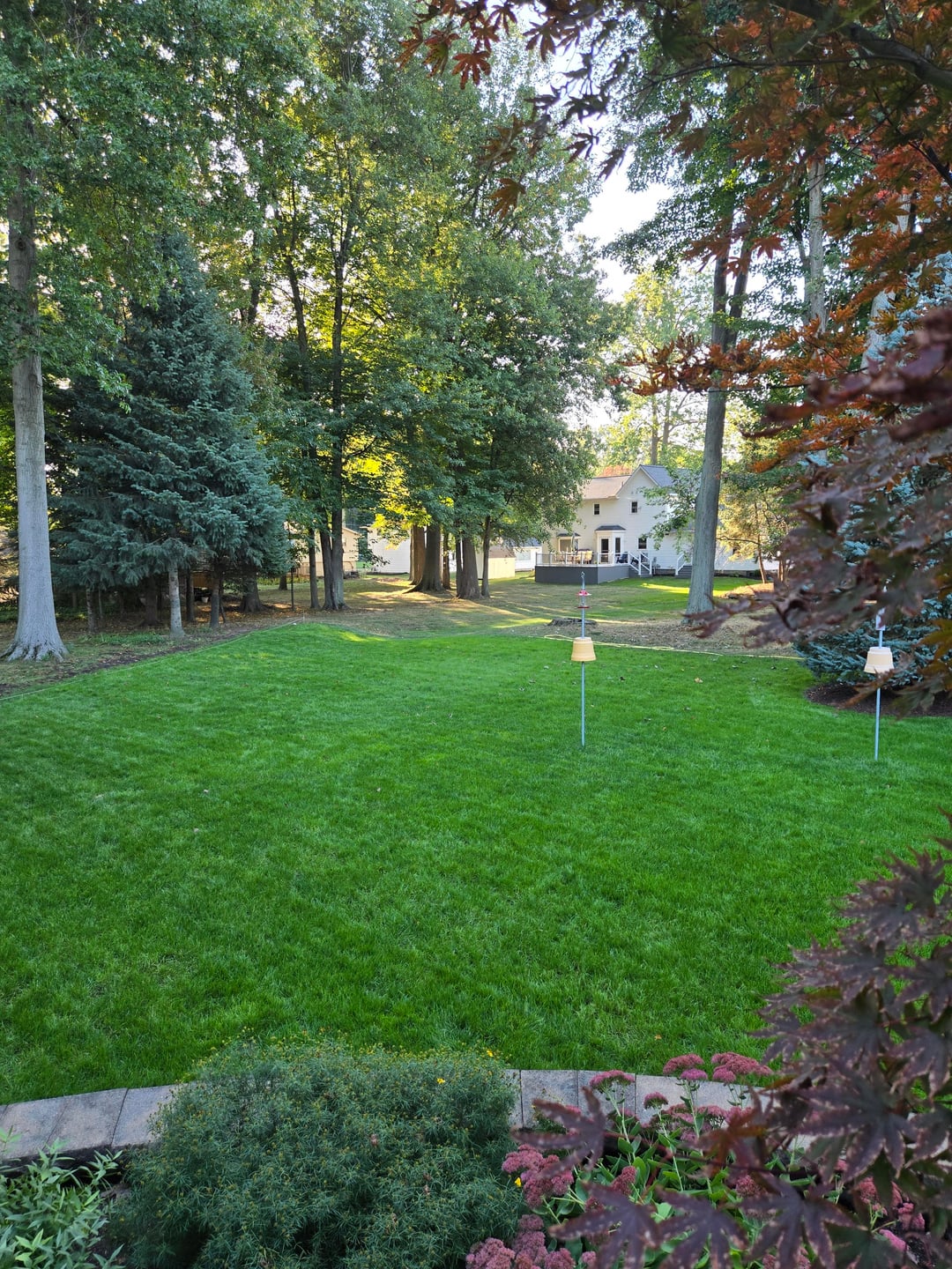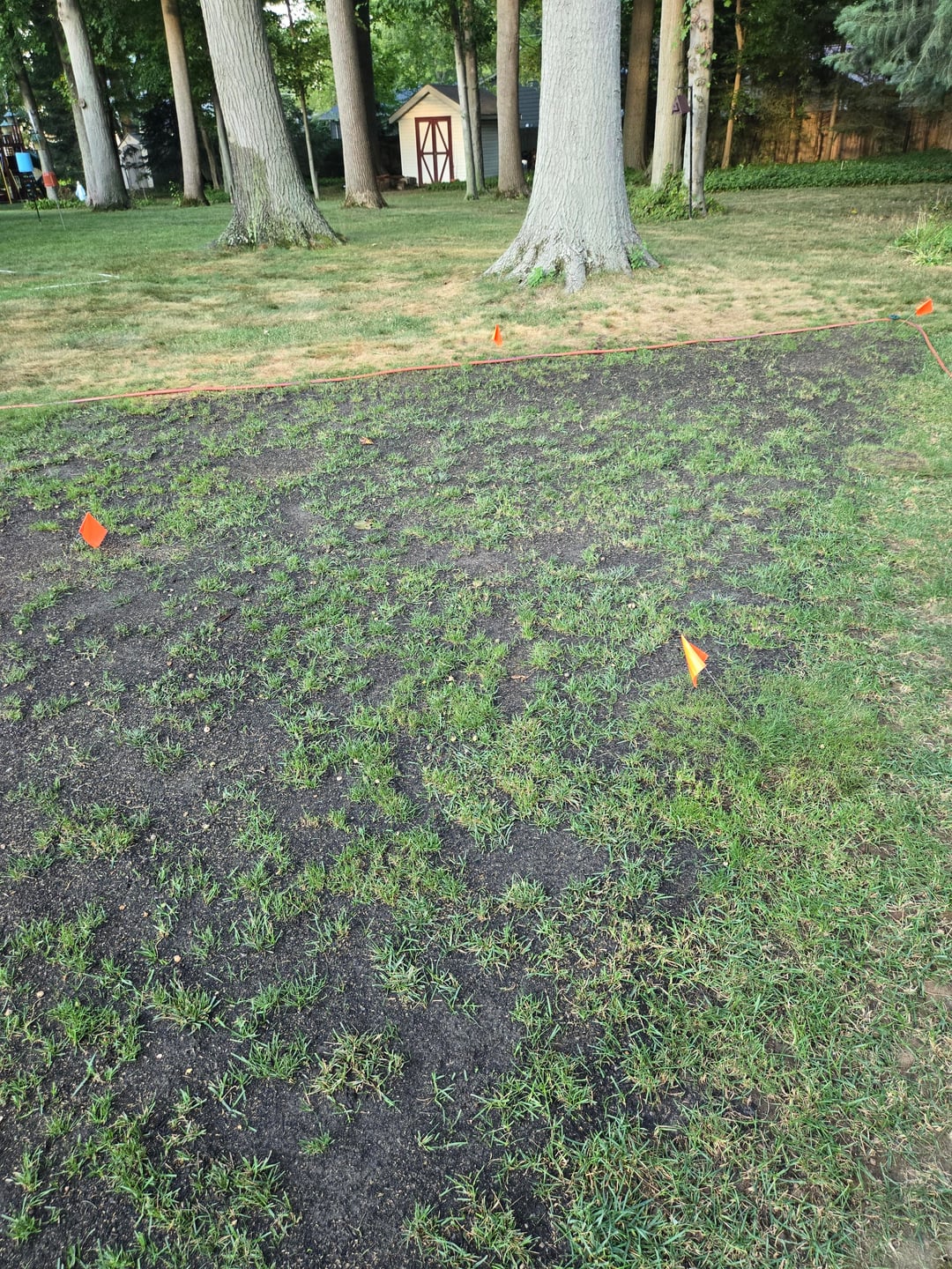 I thatched, areated, leveled and reseeded 5 weeks ago. Used Lesco 50/50 (perrenial rye & KBG) No straw or peat moss. It was unusually warm and dry for 5 weeks. It only has rained twice. Kept moist the entire time. I screened the topsoil by hand using 1/4 inch screen. 7 yards.