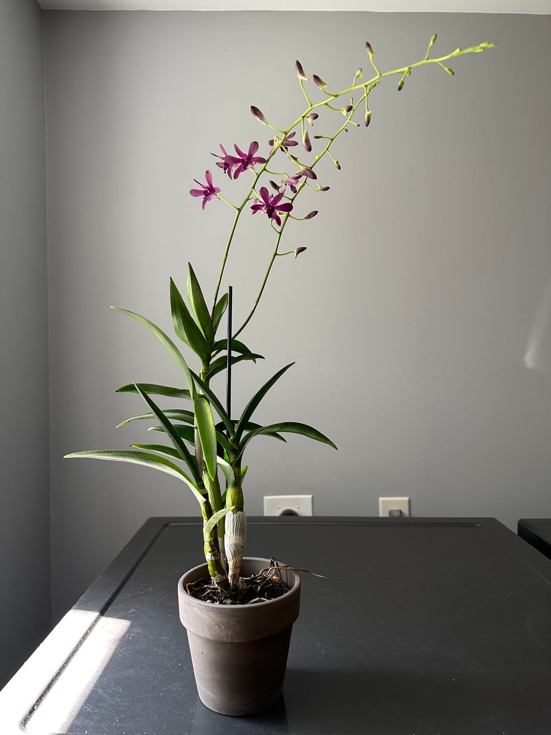 I bought this orchid for $12.50 on clearance at Pike’s Nursery back in February. It was near the end of its bloom cycle. It didn’t do much until I put it under my grow lights. It put out a new cane and surprised me by putting out 2 spikes. There was a possible keiki growing on an older cane, but somehow it broke off before it developed very much.