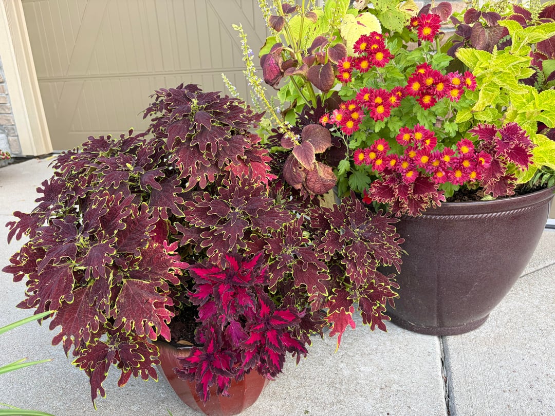 This is my first time planting coleus on the front of my house in my big plant pots and I would 100% do it again. These are amazing plants and they get a lot of nice comments as well. I even had somebody stop by and ask if they could have some cuttings! Of course I gave them some. Share the love! I took some cuttings and I’m propagating them so that I can grow them indoors and replant them in the spring. If anybody knows the names of these coleus, I would superduper appreciate it.