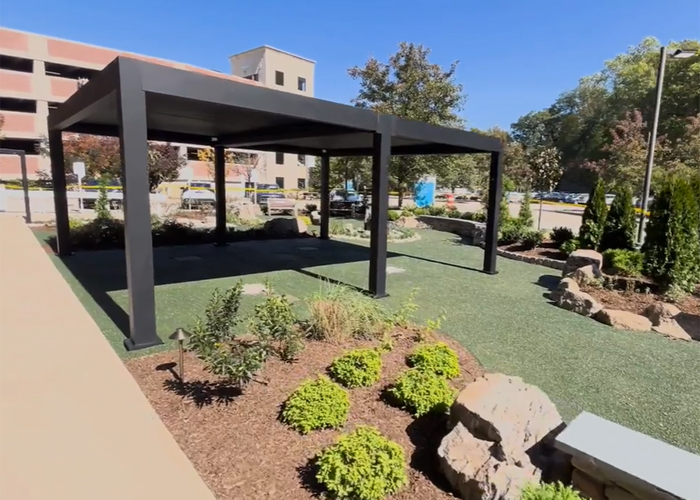 The therapeutic gardens incorporates plants native to the area, a pavilion with a slatted roof that adjusts to sunlight and airflow, a calming water feature, benches and ambient lighting.