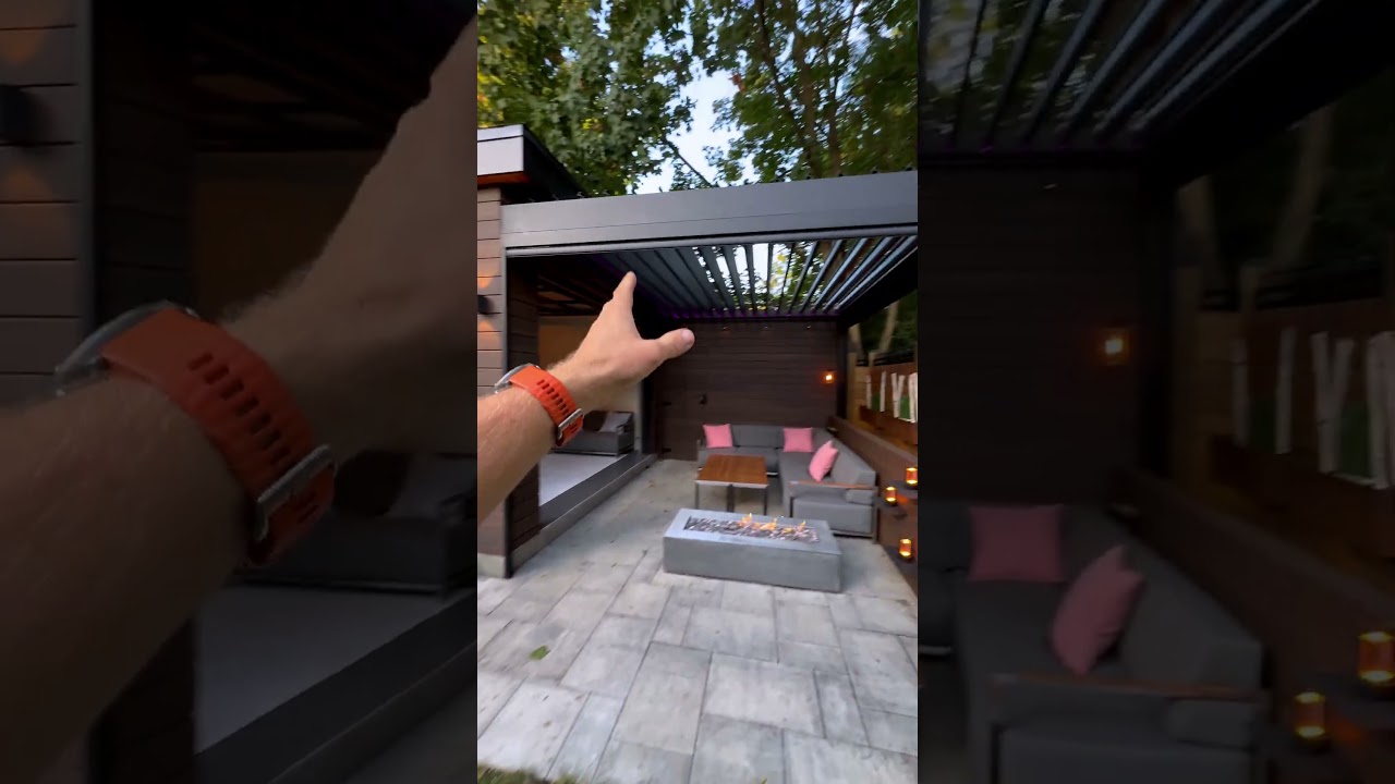 Here are three main areas of this backyard. Number one is the composite deck at the house with a louvered pergola that is right off the patio door. We have privacy screens, lot of lighting and it’s composite, so it’s low maintenance. Then we have a dining area here that has a large privacy screen with awning that covers pretty much the whole table. The last one, the most important is this space here, the threeseason room connected with a louver per. When we have this glass garage door open, it creates a one large usable space here with a seating, TV inside, bar, cabinets, running water, heater, everything. Perfect to enjoy during the summer time. But when it gets colder, you can actually close the garage door and the sliding door and the space is insulated with a heating. So you can enjoy this deep into the fall or early springtime.