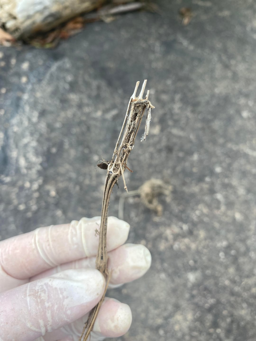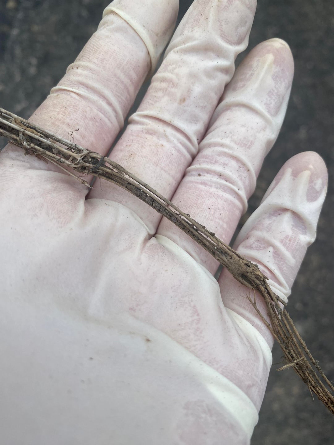 Was this found near a creek/river? I believe these are the rhizomes of Justicia americana, water willow. They are very unique and intentionally develop that way to stabilize gravel/sandbars where they occur.