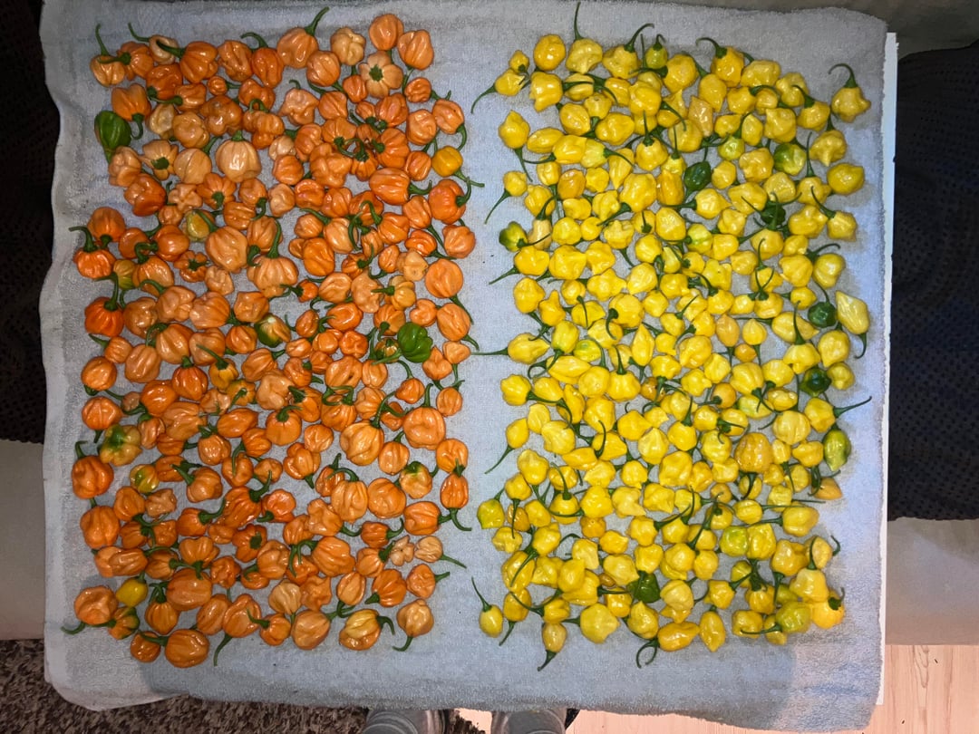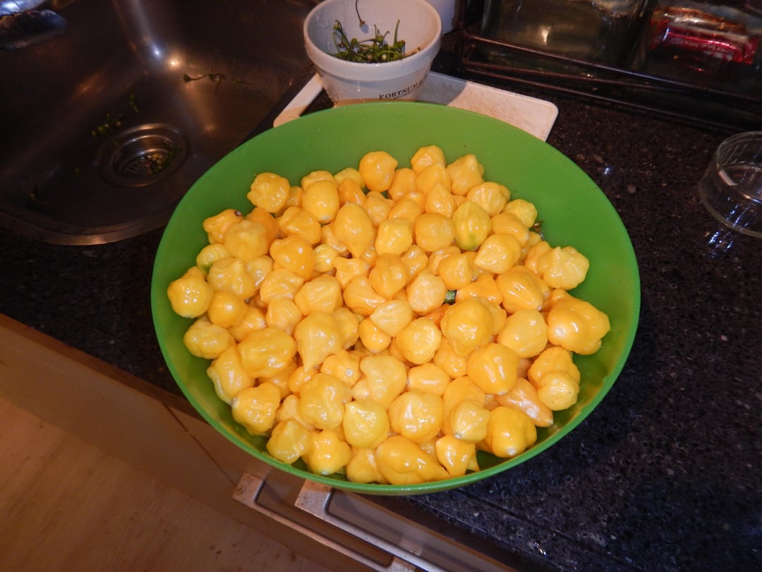 about 2 kg or 4.4 pounds total of Bahamian Goat and Yellow Bumpy peppers (100,000-350,000 Scoville).