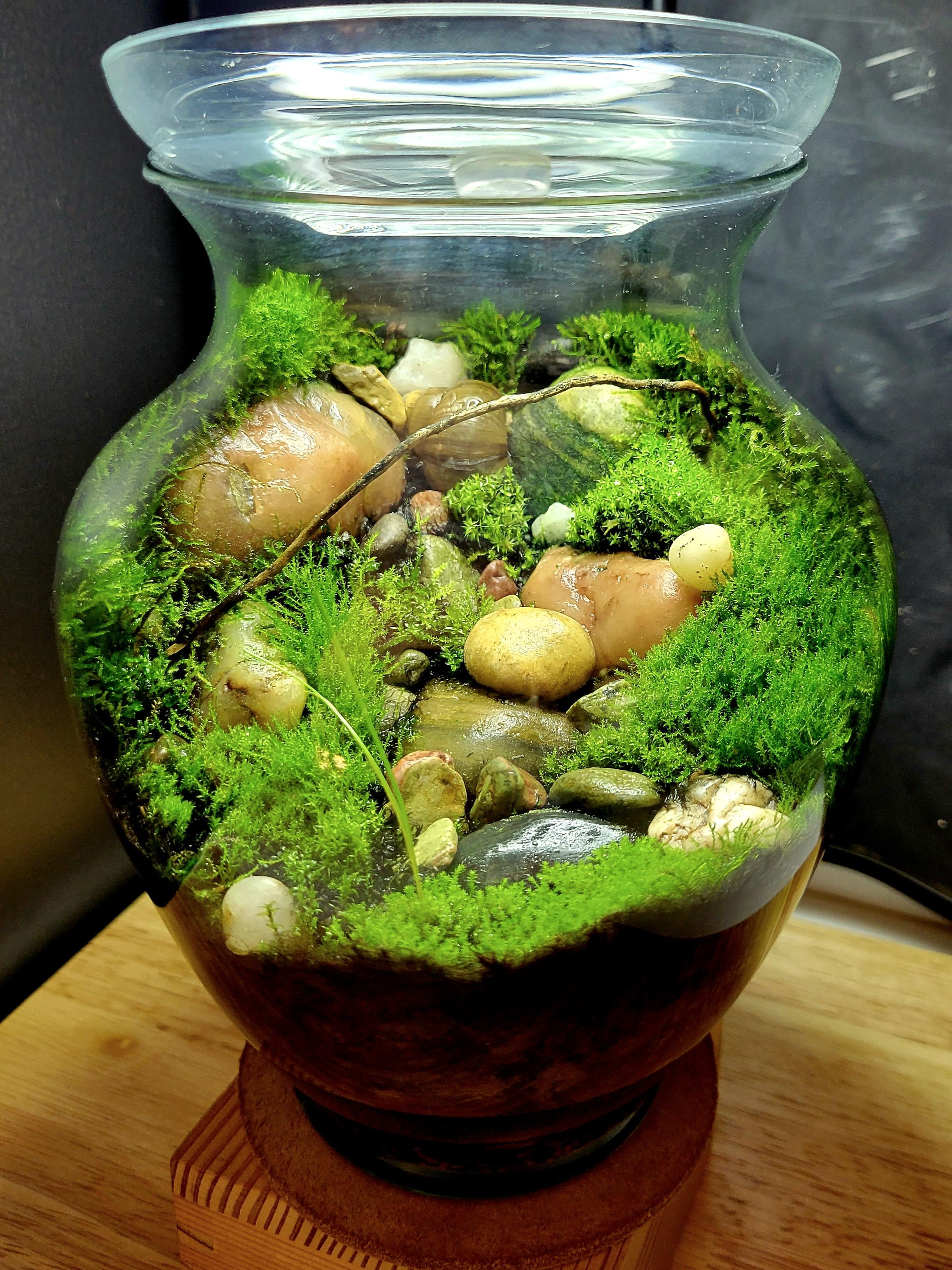 Don't even know how many are in here now, because if one dies I find something different and put it in this jar. I've added four or five aquarium mosses and about the same wild moss. Started 7 months ago.