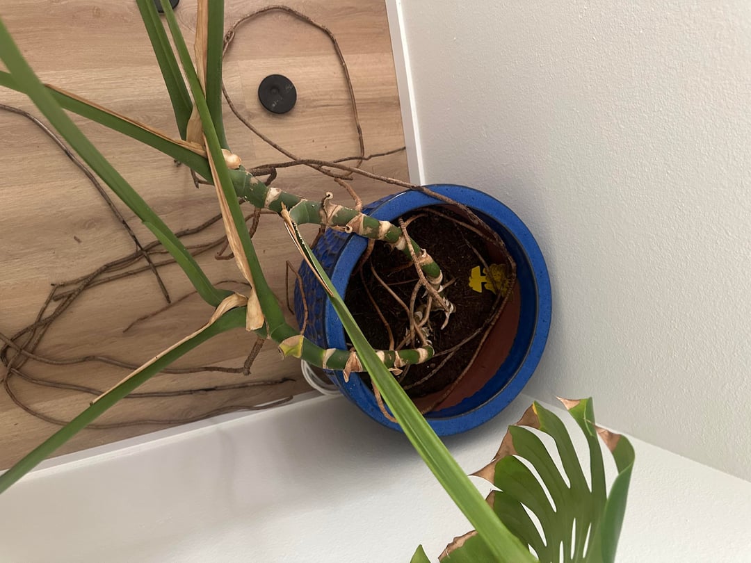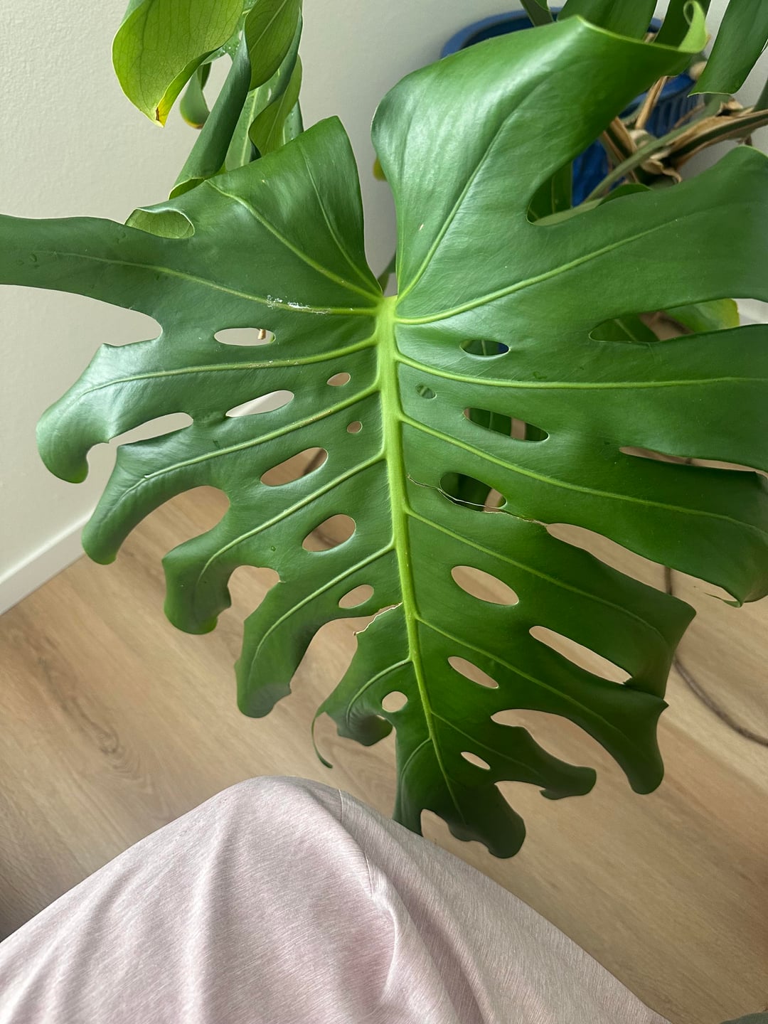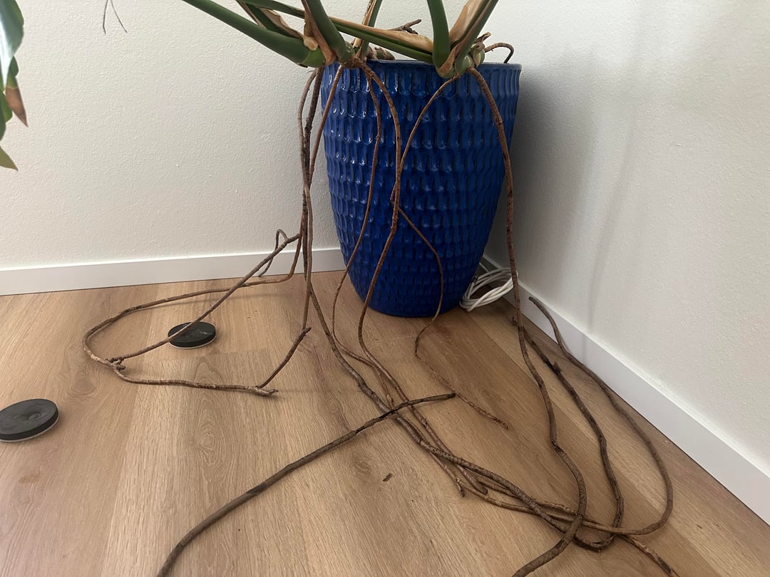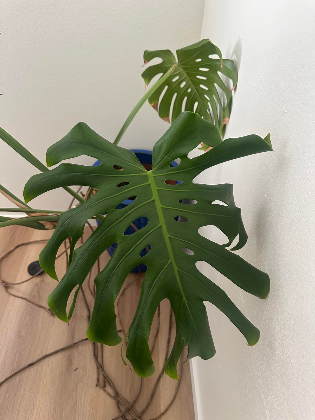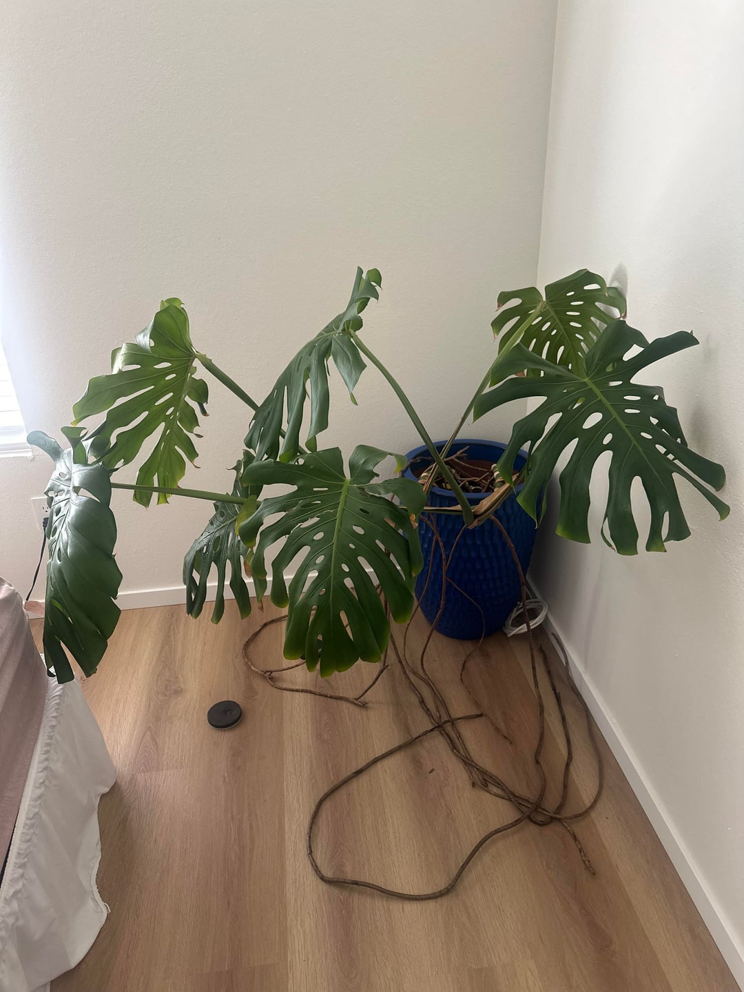 I just inherited this monstera. I don’t have any info on it. This is the current state it is in. Is it fine like this or should I try and repot it with a moss pole? I tucked the roots into the pot that were originally left on the floor when I received the plant but don’t know if that’s the right decision. Thanks for the help!