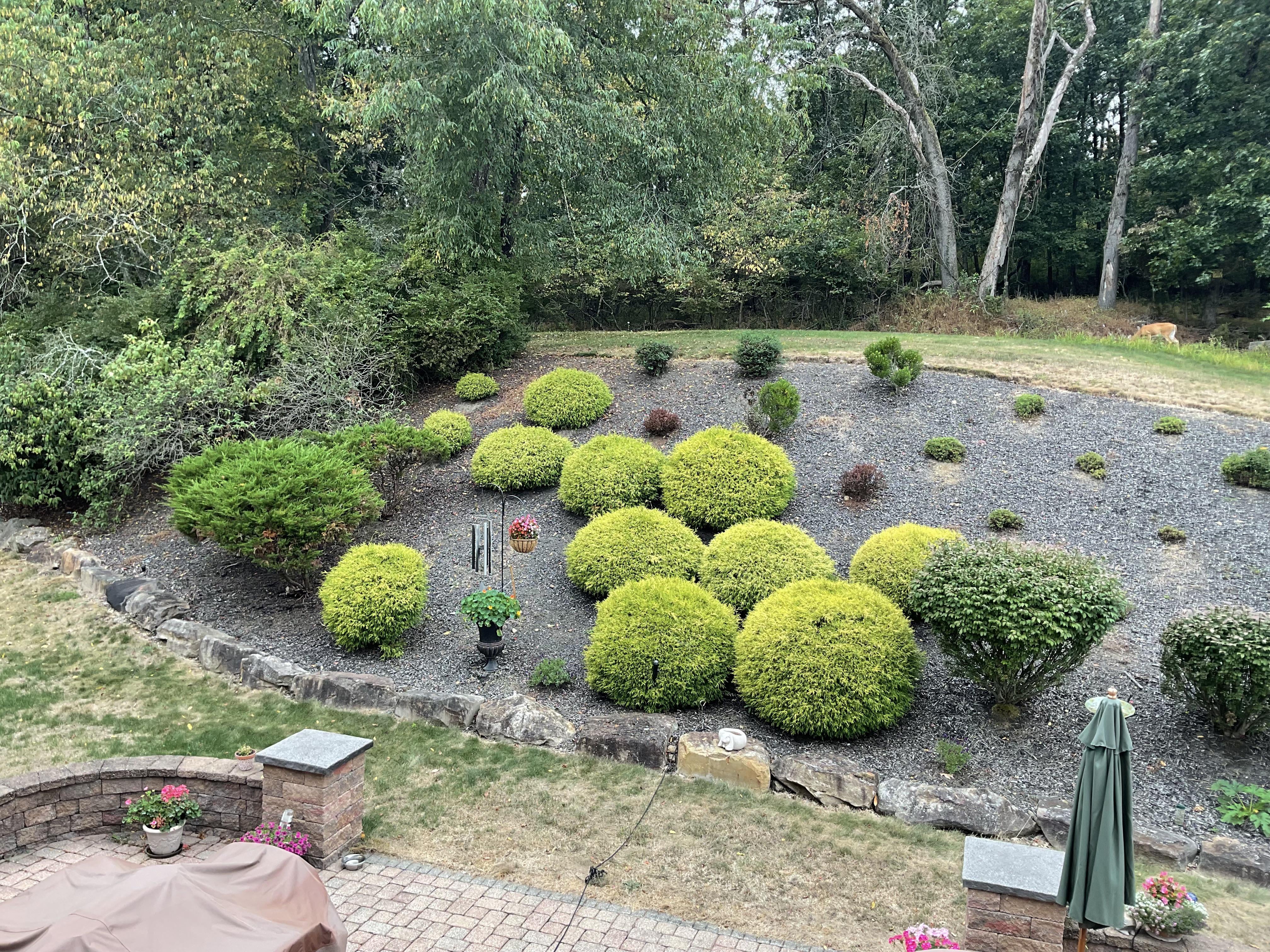 Moved into a new home this past summer and, well, I just don't love these balls of cypress in a hillside behind our patio. They are healthy and happy (unlike the many other nearby shrubs that have been decimated by deer over the past few years) so I will not get rid of them. But their form, well, I just don't like the formality of it. I am planning to plant a more natural, casual area.