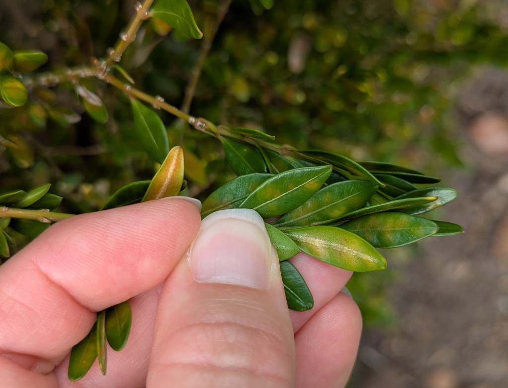 Some boxwood cultivars have greater resistance to leafminer than others. When the insects are too abundant for their damage to be tolerable, prune out the infested branch tips or, as a last resort, consider using an insecticide to reduce their numbers. Keep in mind, though, that insecticide use can have unintended consequences: it might facilitate an increase in the population of boxwood spider mites; harm pollinators visiting the boxwood’s flowers; or harm insect or spider predators wandering its foliage that would be eating pests.