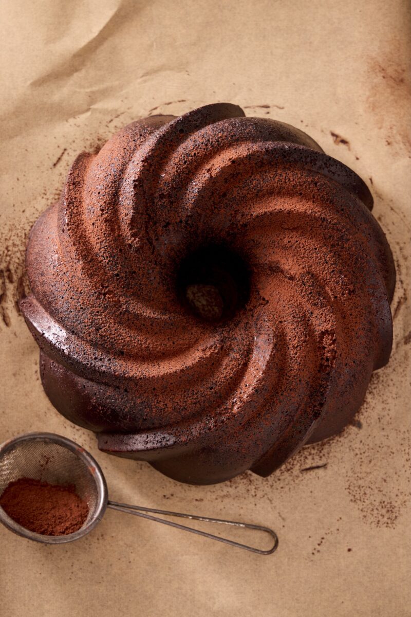 Bundts are beautiful, but it is really important to properly prepare all the nooks and crannies of the Bundt so the cake doesn’t stick to an odd corner. You want this cake to slide out beautifully, and I recommend a heavily buttered pan dusted in cocoa powder to avoid sticking.