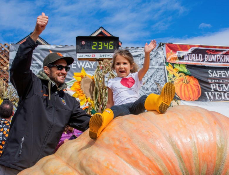 Brandon Dawson, a gardener from Santa Rosa, Calif., and his daughter, Ayla, 3 celebrate after winning the 52nd annual Safeway World Championship Pumpkin Weigh-off in Half Moon Bay on Monday, Oct. 13, 2025 with a 2,346-pound pumpkin. Dawson’s pumpkin outweighed his closest challenger by more than 300 pounds and brought in a prize of $21,114. Second place went to Bran Werner of Gridley, for a pumpkin that weighed a mere 2,017. (Megalith via Bay City News)