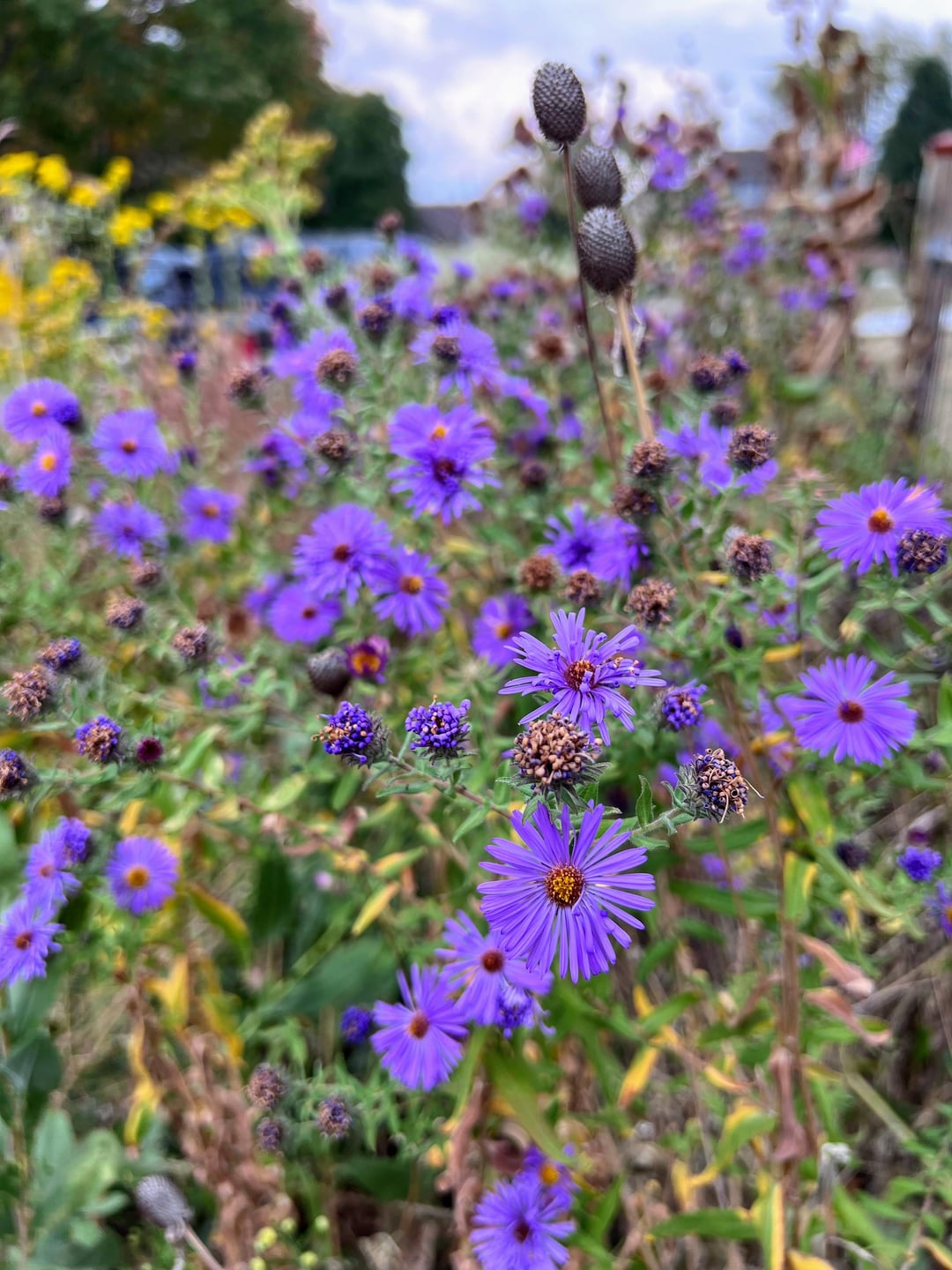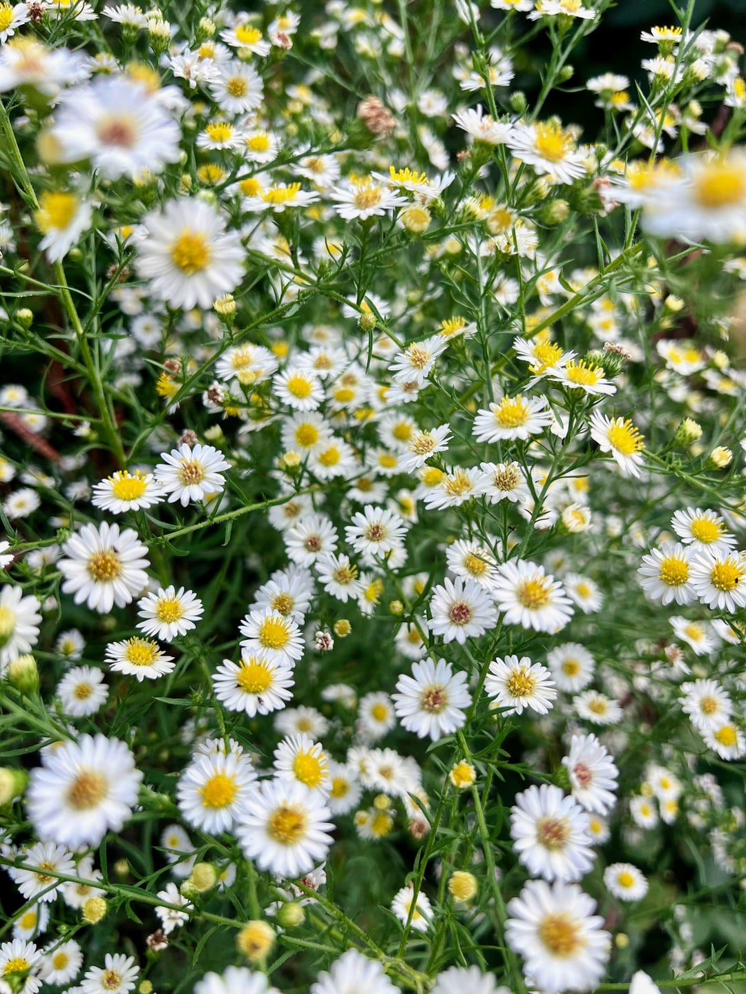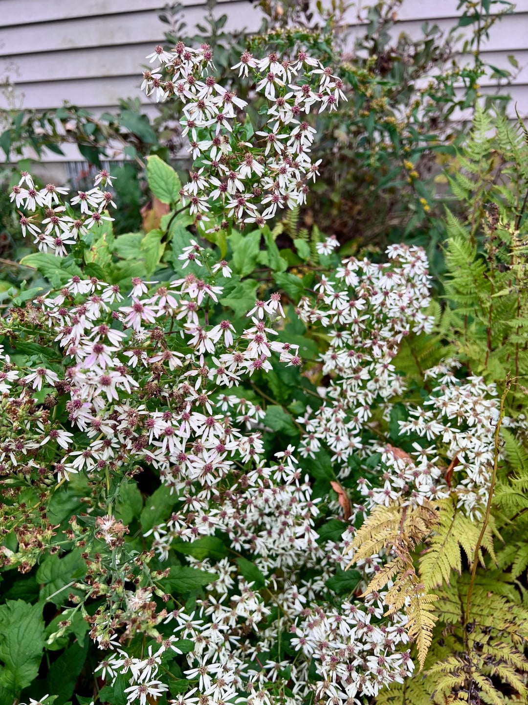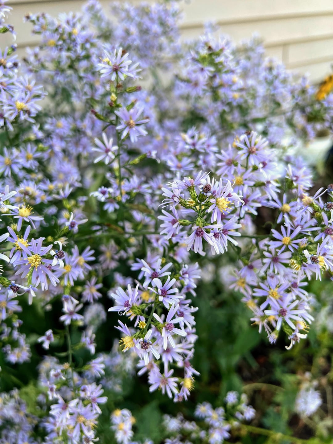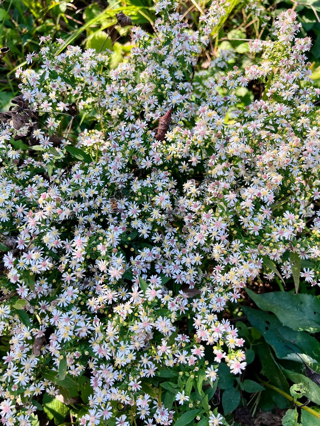 Heath Aster, Heartleaf Aster, and Smooth Blue Aster all reseed a lot in my yard. Heartleaf Aster is the most prolific, as it grows well in most light and moisture conditions. I used to weed a lot of these volunteers when they popped up; I still do this, but not as much as I used to. I like to see where these plants want to grow and tend to remove them only if they're blocking my view of a smaller plant. To prevent some of these asters from flopping over if they're growing too close to the edge of a bed, I prune them in late spring or early summer. This causes the plant to grow bushier and also pushes back when it will flower. Heath Aster is my favorite to prune back because the pruned plants produce more, tinier flowers. Check out the last photo for an example of the size difference! I'm not sure why the plant does this, but I think Heath Aster would make a fun potted mum alternative, and I want to experiment with how much to prune it to achieve a more compact, mum-like form.