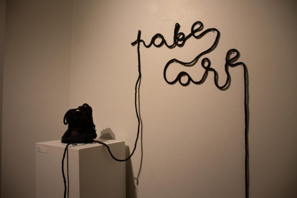 A shoe connected to words that say ‘take care. Painting called “Sentiment”