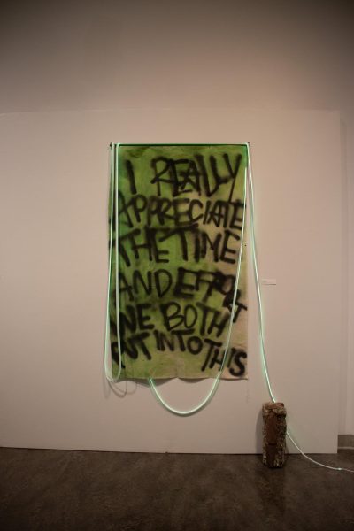 A sign that says ‘I really appreciate the time and effort we both put into this.’ Artwork called “ 3-Month Rule” (Fatima Ali)