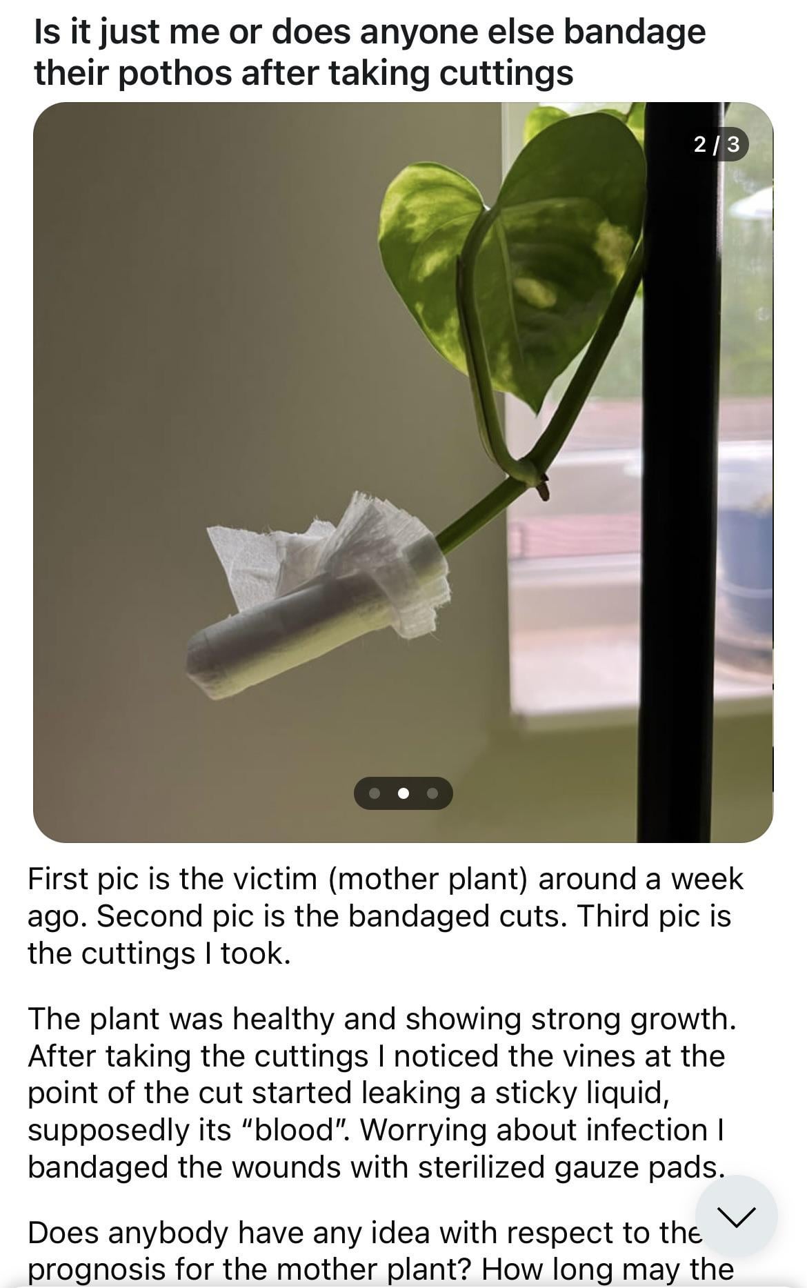 Administrative_Cow20 3 days ago In all my years, I have never seen… this. Plant Bandages. You’ll see me next week on Shark Tank making a million bazillion dollars with these!!!