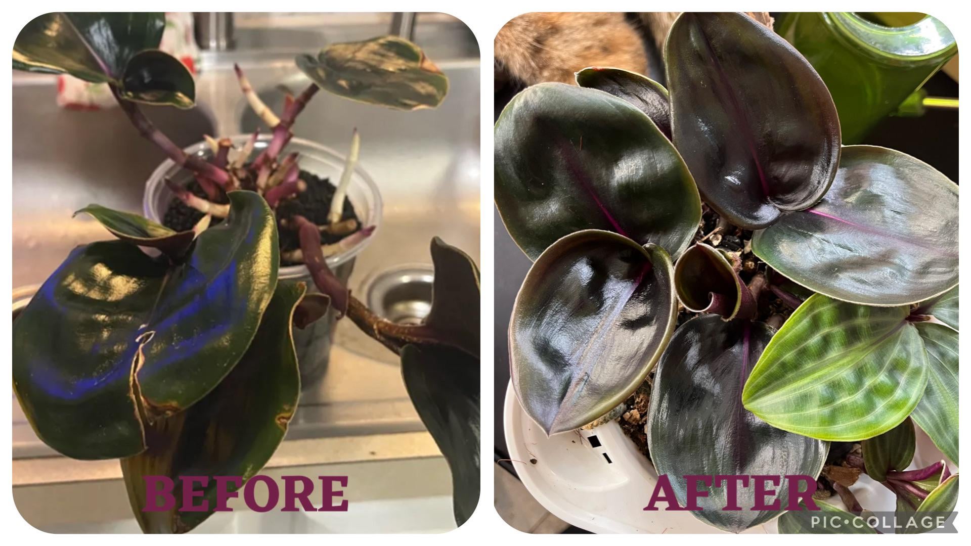 After photo is today. She’s been growing in a self-watering pot for a while, now looking cute and compact. 💜