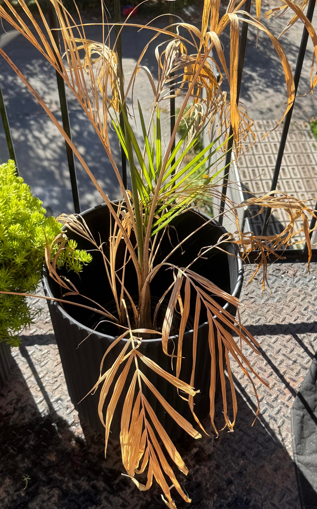 How would I go about restoring this palm to health? I have a black thumb but I couldn’t bare to leave this thing on the curb when it had that green shoot. I’ve watered it for a week now a little bit daily but have no idea what I’m doing. It’s currently on a balcony but our first frost is coming so it’ll have to be moved indoors. I do have a sky light inside if that’s helpful.