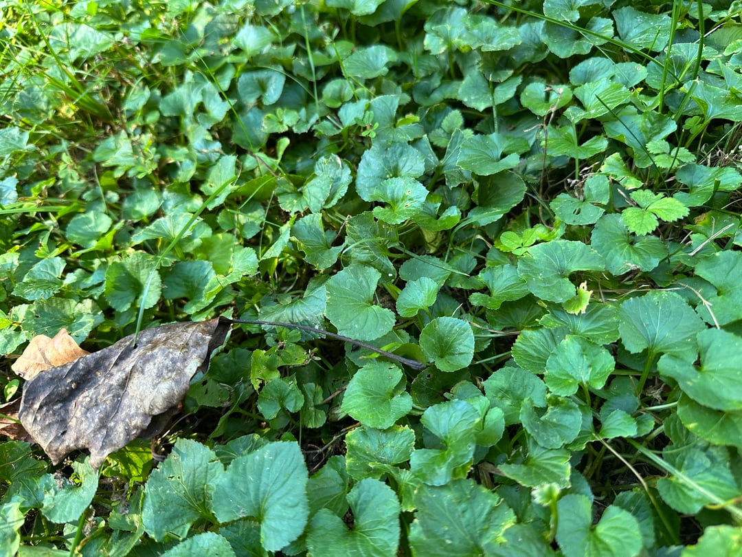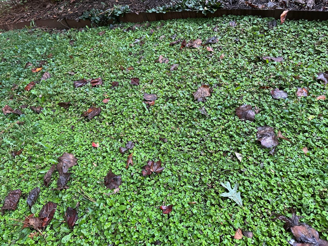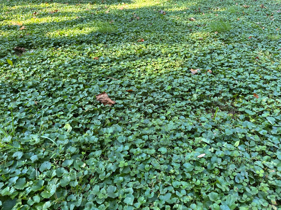 My back yard has dappled shade and lots of moisture, so previous attempts to grow grass left muddy bare spots. Three years ago I decided to let it go to its natural state, and dichondra replens, wild strawberries, and violets popped up on their own. I added mini clover and more violets. Now the far back yard is full of violets that turn the hill purple in late spring, and the yard looks lush with the combo of green groundcovers. I mow every few weeks so any tall grasses or plants don’t start dominating the space.