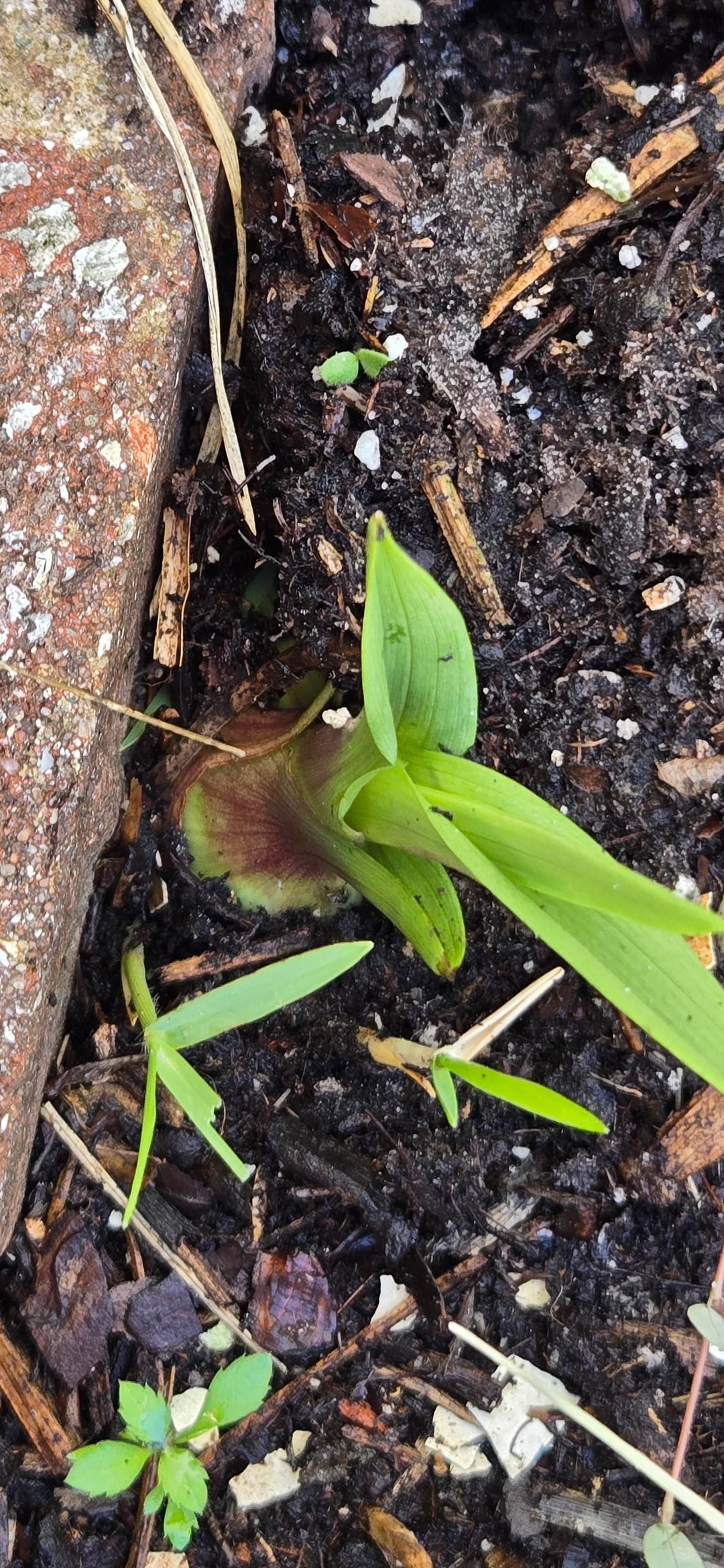 This just popped up out of nowhere. I haven't checked on this bed for a couple weeks and I didn't plant this (knowingly). The bulb looks like some sort of onion but the leaves look like it could be something else. Possibly from something that was in my compost.