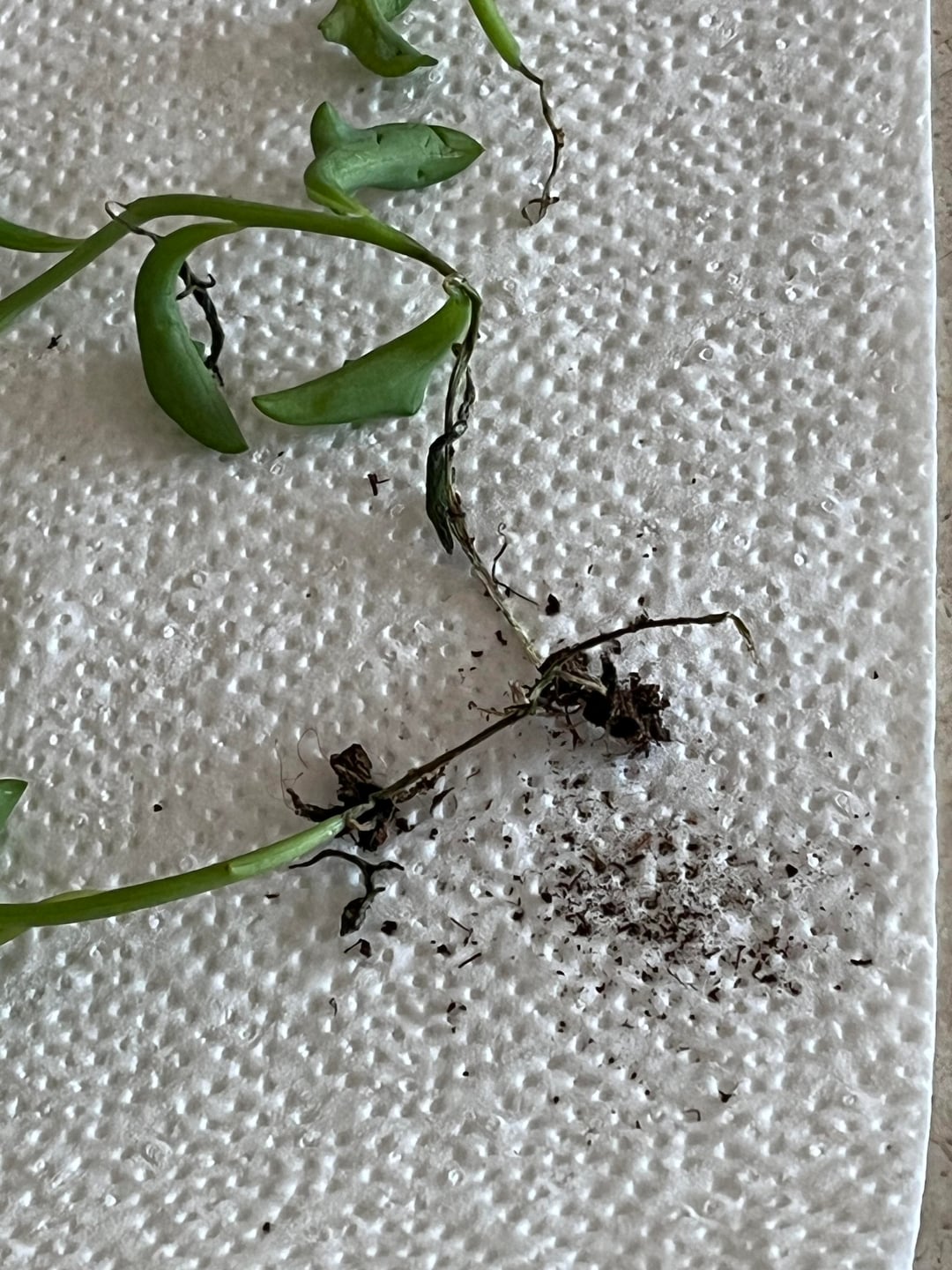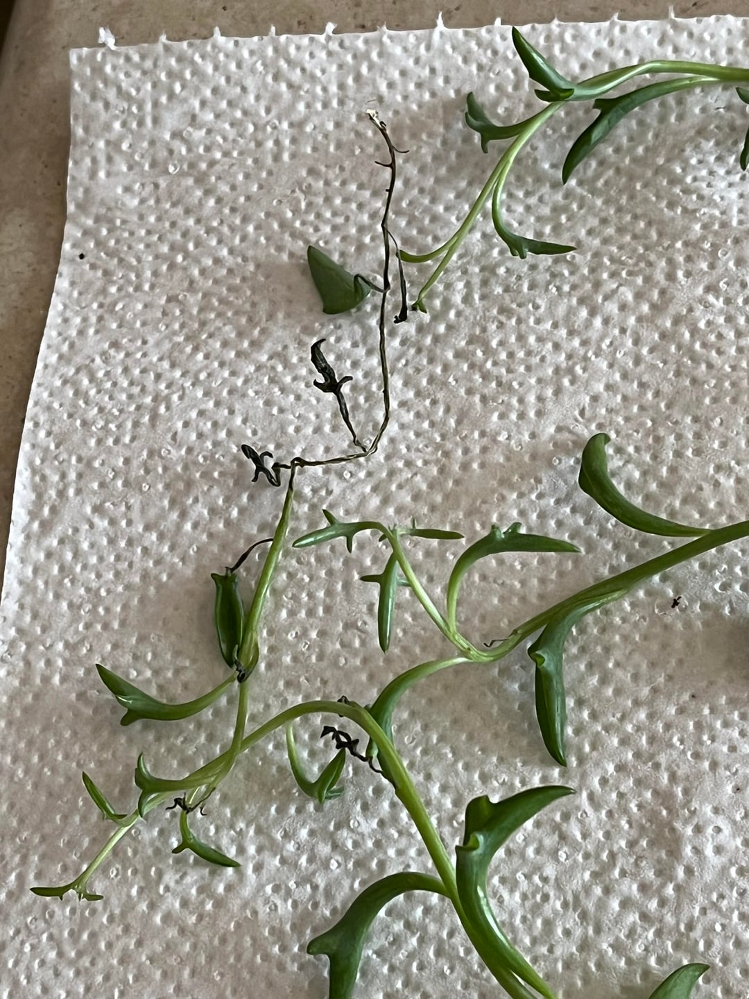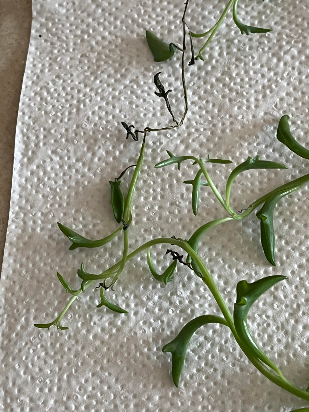 I fell in love when I seen a post with these dolphins! But I never have really ever seen or heard anyone near where I live in Australia. So I was super excited to see them, so I grabbed them and came home. I ain’t got the best sunlight condition in my unit unfortunately. I do have a few lights though but because I havnt really had much to do with succulents and stuff my knowledge is minimal of everything about them pretty much apart from don’t keep them soggy or water too much. Anyway as you can see in the pic there ain’t many strands of dolphins left in the pot. What you see on the paper, is the rest of what was in there…. And I’ve only had it a bit over 2-3weeks. I watered it when I got home coz it was bone dry…. But I bottom watered coz there are fungus gnats hanging around the units right now