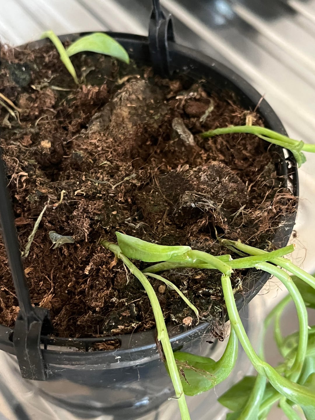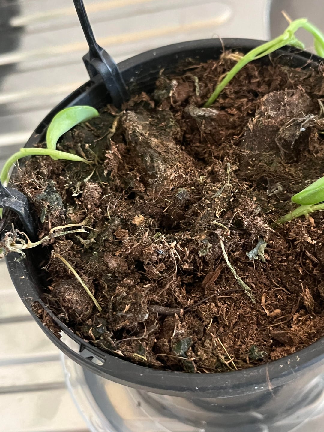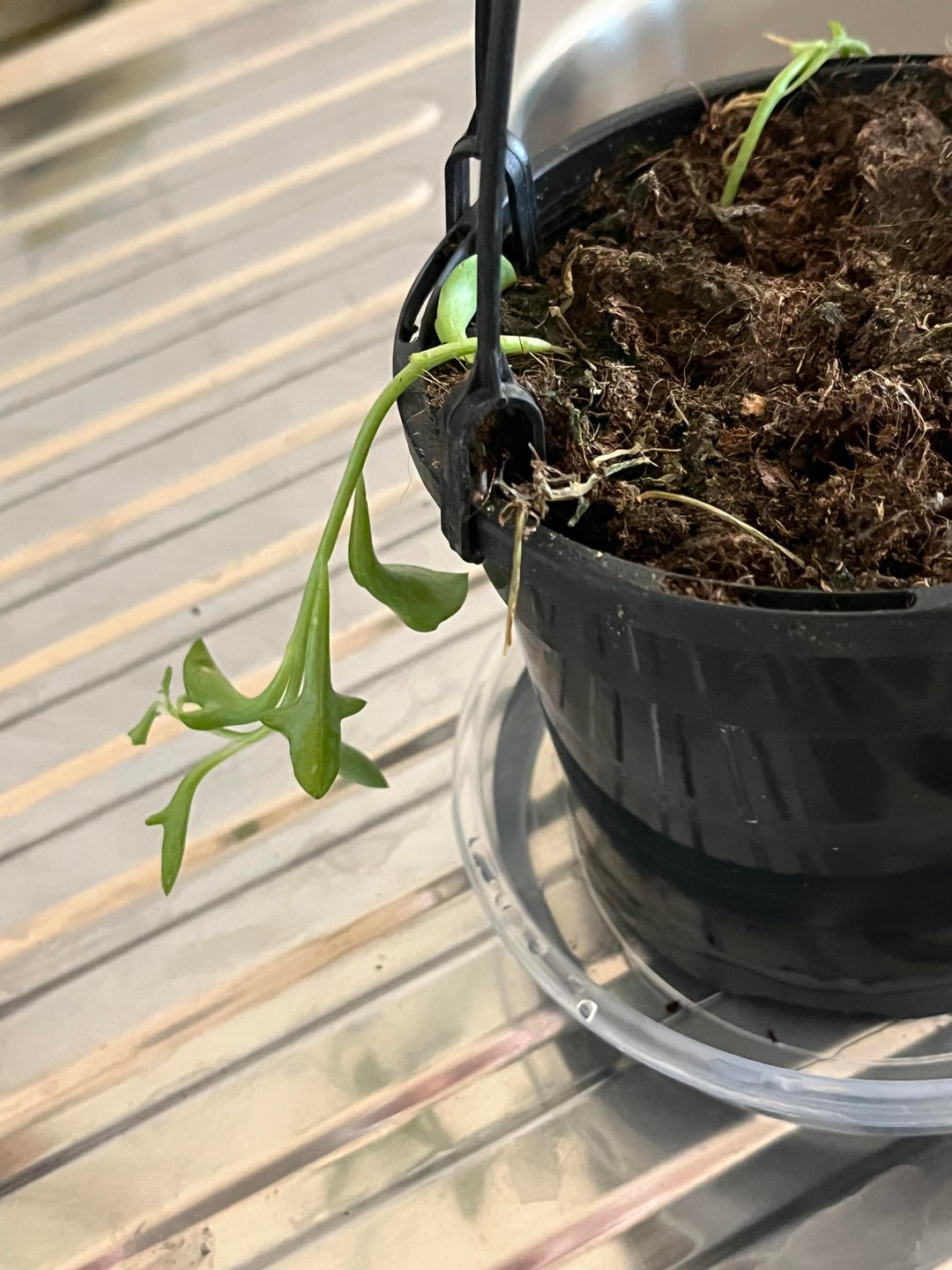 As you can see strands have been coming out the dirt, baby dolphins drying/dying before they even have taken proper shape. I thought it must of been a lighting issue… but this morning I notice some of the bigger dolphins are starting to look a bit wrinkled…. And I kinda have a feeling that meant dry!!!!! So I checked and it was BONE DRY!!!!!! So I’m giving it a drink right now….i just want to know should I keep the remaining that are left, in that original pot? And also I don’t want to loose all the string that have snapped off this week…..so how would I prop them?can you prop them in water? How would I go about it?