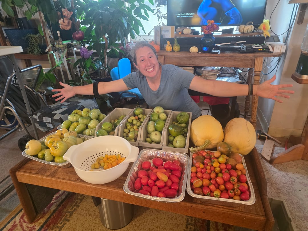 We have our first frost predicted soon, so everything is in! In addition to all this, we have 2-3 bags of ripe tomatoes in the freezer.