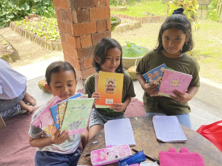 Students at Rimba Garden School showing their new notebooks after class. Photo: Maria Xaver Dover