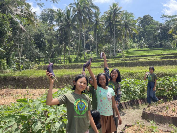 Children from Rimba Garden School proudly showing freshly harvested eggplants in the garden. Photo: Maria Xaver Dover