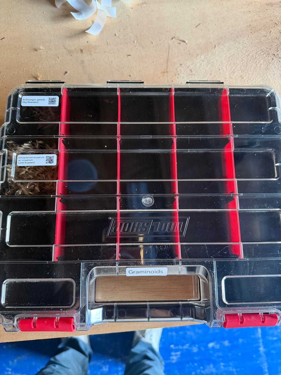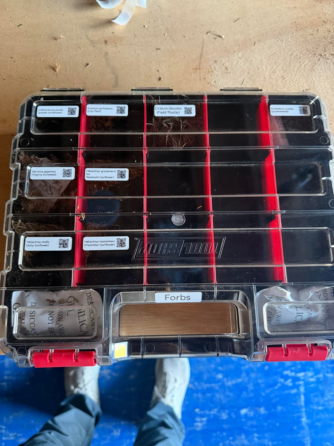 How is my setup looking so far? One side for forbs, one for graminoids. Then I’ll get another box for woody species and aquatics/random. How do you save your seeds?