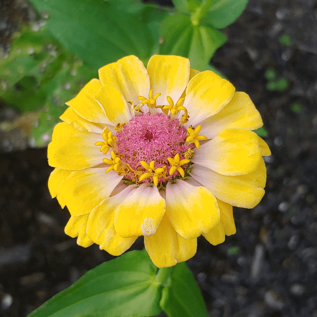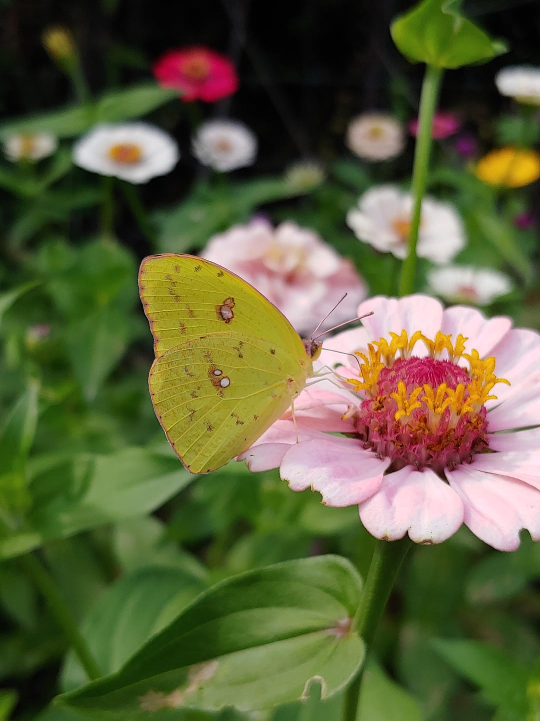 Description: zinnias and a cloudless sulphur butterfly