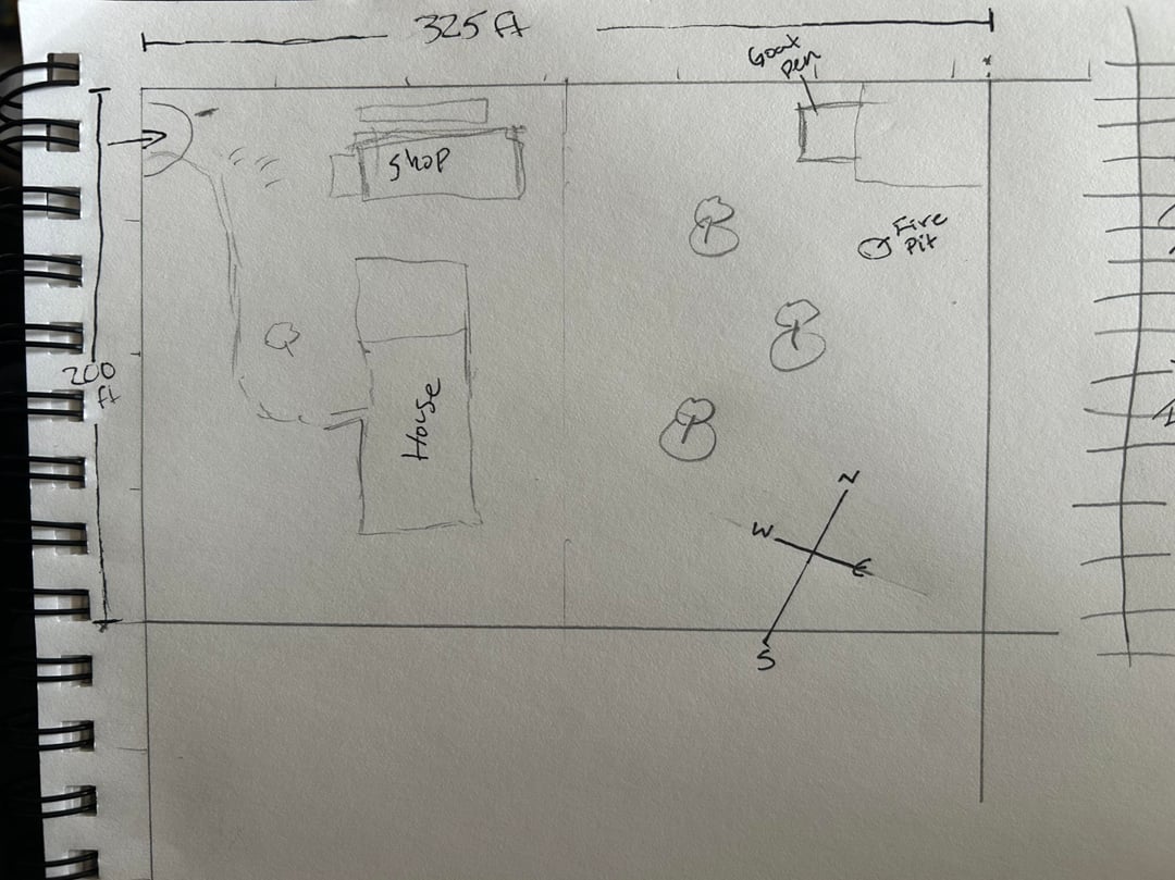 It would probably be nice to put a border of larger/denser (preferably evergreen) trees along the back to block some of the noise from the railroad (+ privacy) it would also be good to plant some sort of buffer between the goat pen and the house (assuming you have goats) to prevent smells travelling. People usually like to have a small, more well maintained recreational/relaxation area near the house and then have the more “wild”/less frequently maintained stuff farther away, both to make maintenance easier and to make the area as beneficial to wildlife as possible by avoiding scaring animals off/disturbing nests and such with yardwork. But you could also do a cool maze style garden where you have thin paths leading between densely planted areas that open into specific use zones, like little satellite patios, a pond or the firepit.