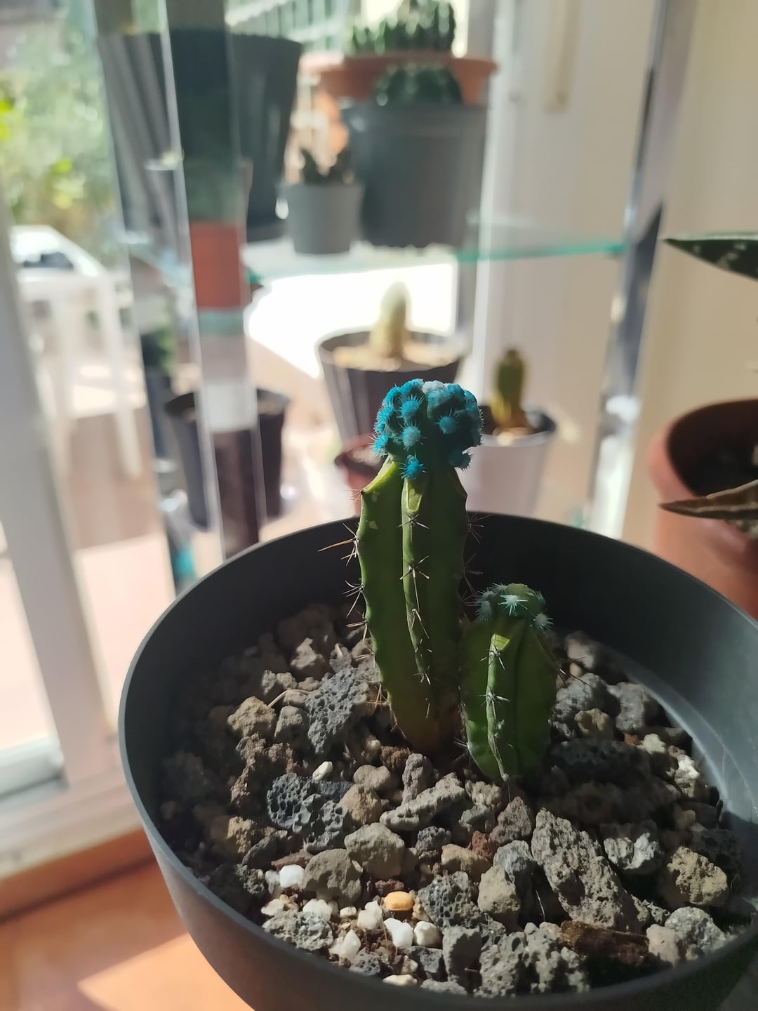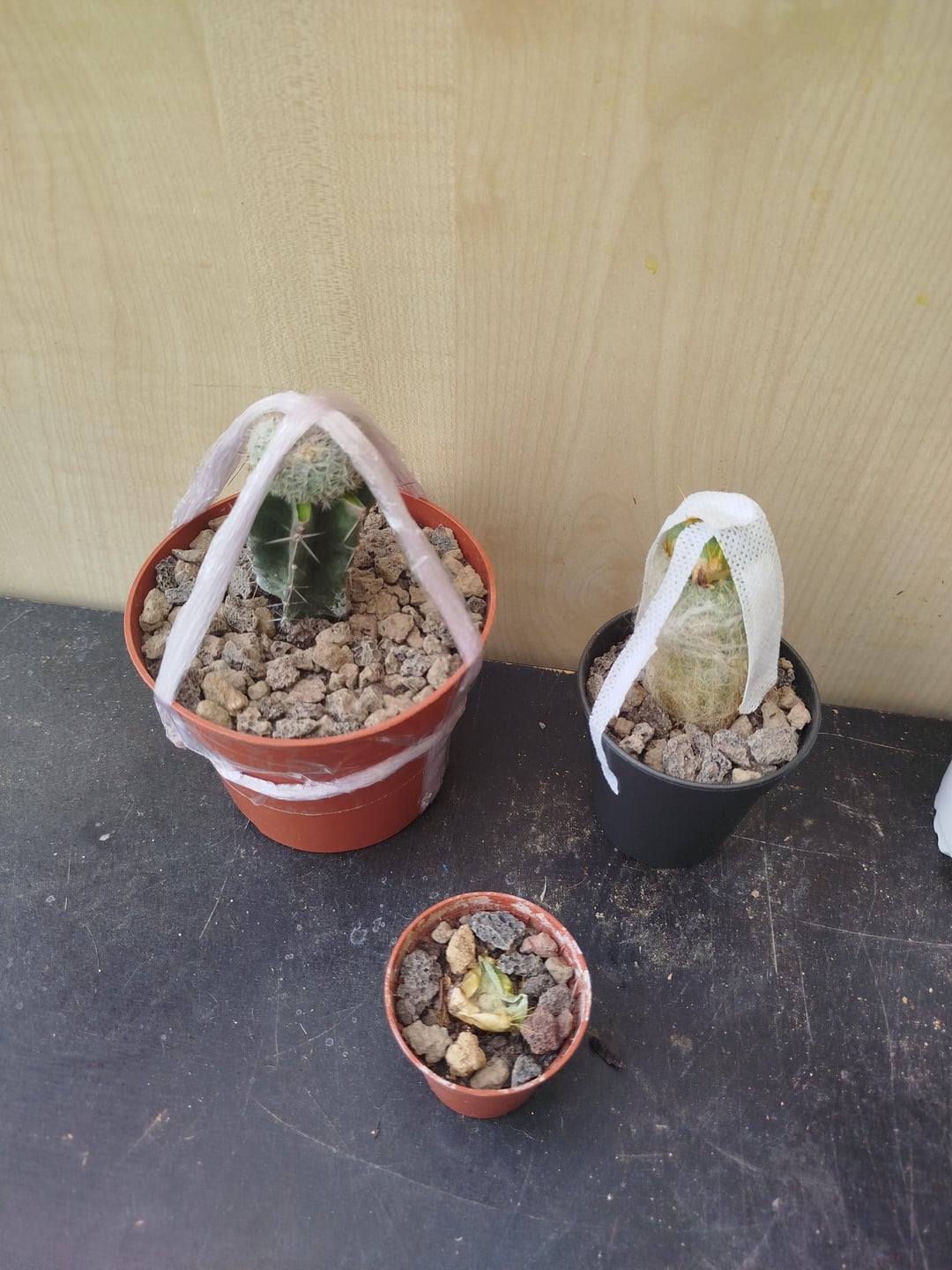 The one in the fourth photo was rejected by the tutor and did not survive, and the sixth was an attempt to save the grafted one but is currently well attached but with a dry brown color. Two months ago I became interested in cacti and these have been my first dives into the grafting world, little by little trying to improve and above all enjoying these wonderful plantsđ”âš.
