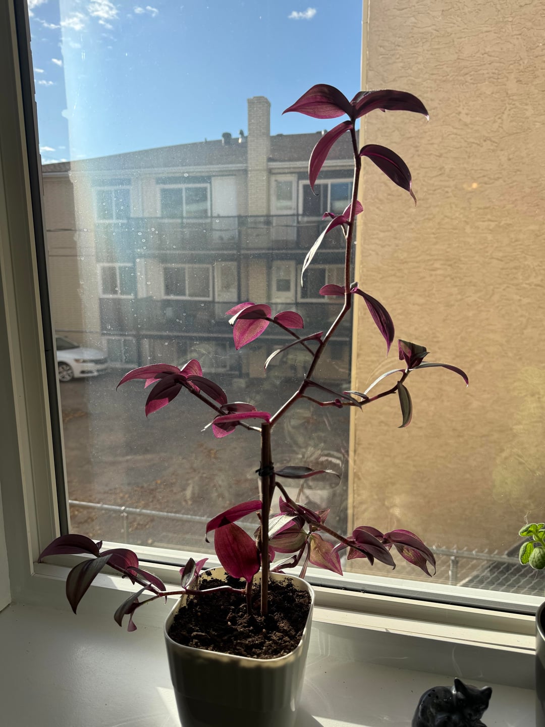 That’s a tradescantia / inchplant – they aren’t actually meant to stand up! They creep along the ground, and send out new roots at regular intervals (if there’s enough soil for it). You can just let it hang and sprawl, and it will be much happier, or else allow it trail into another pot