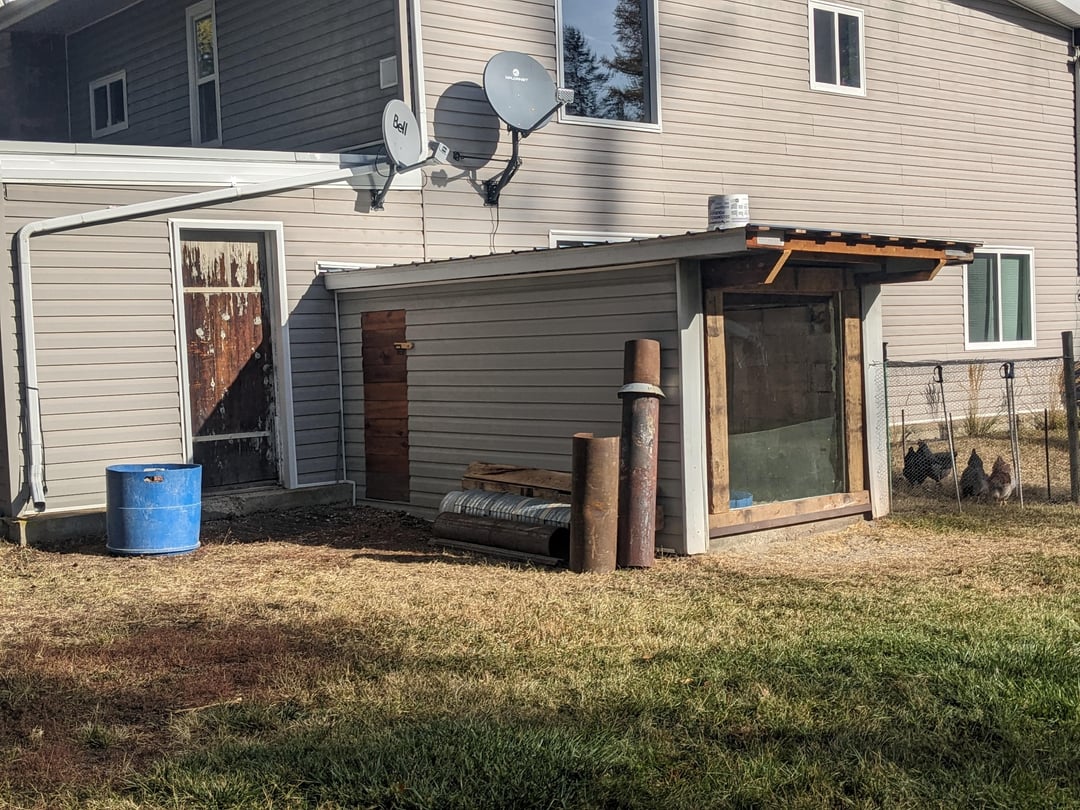 Pretty proud of our new coop. The addition used to house a massive wood burning stove, which we had to decommission when we got our place because it wasn't done to code. Took the stove out, put in a floor to ceiling window, and used the old pipe holes as portholes into the nesting boxes. Whole thing is insulated as we get down to -35c here in the winter. Dogs love the view, too.