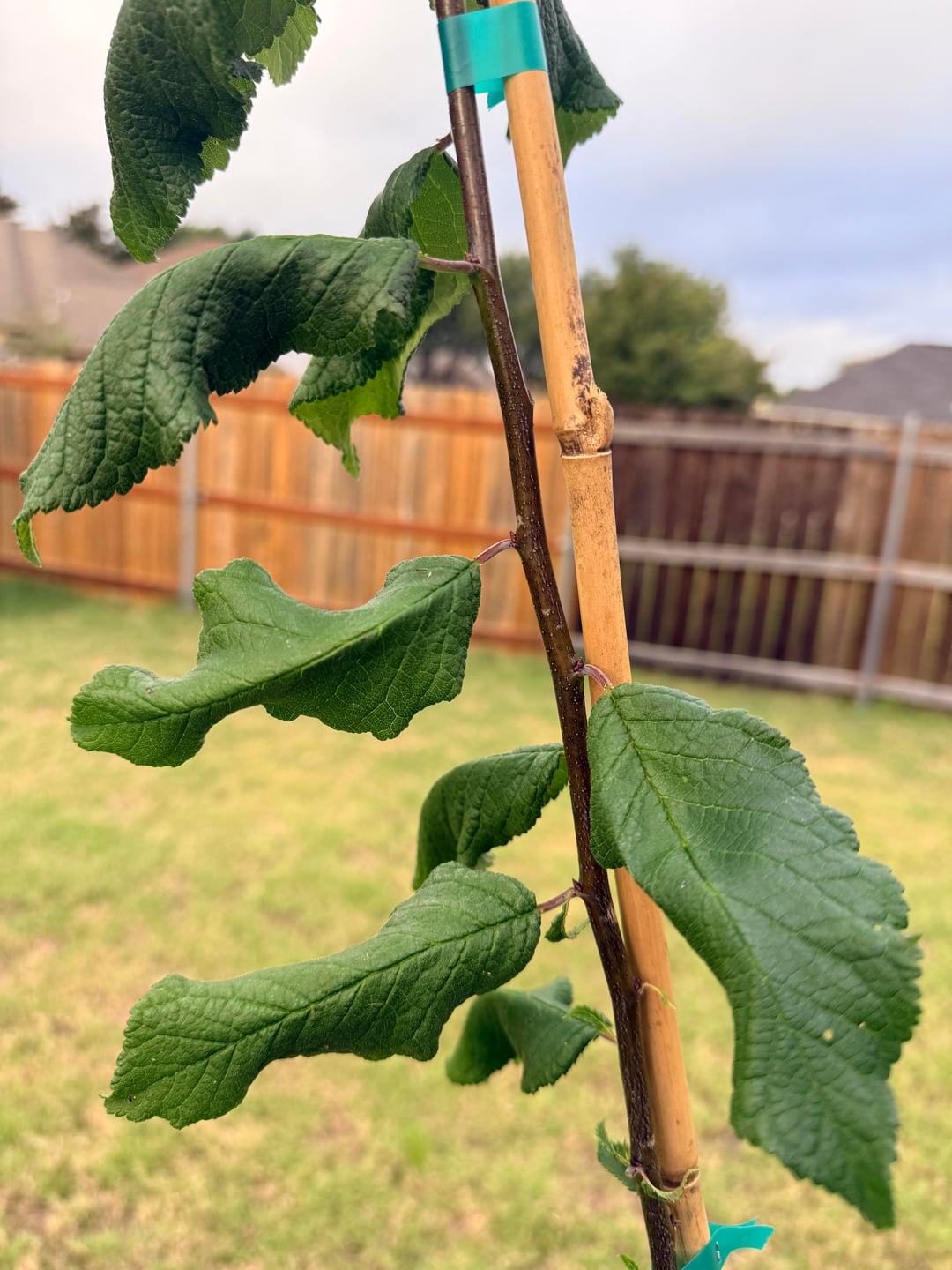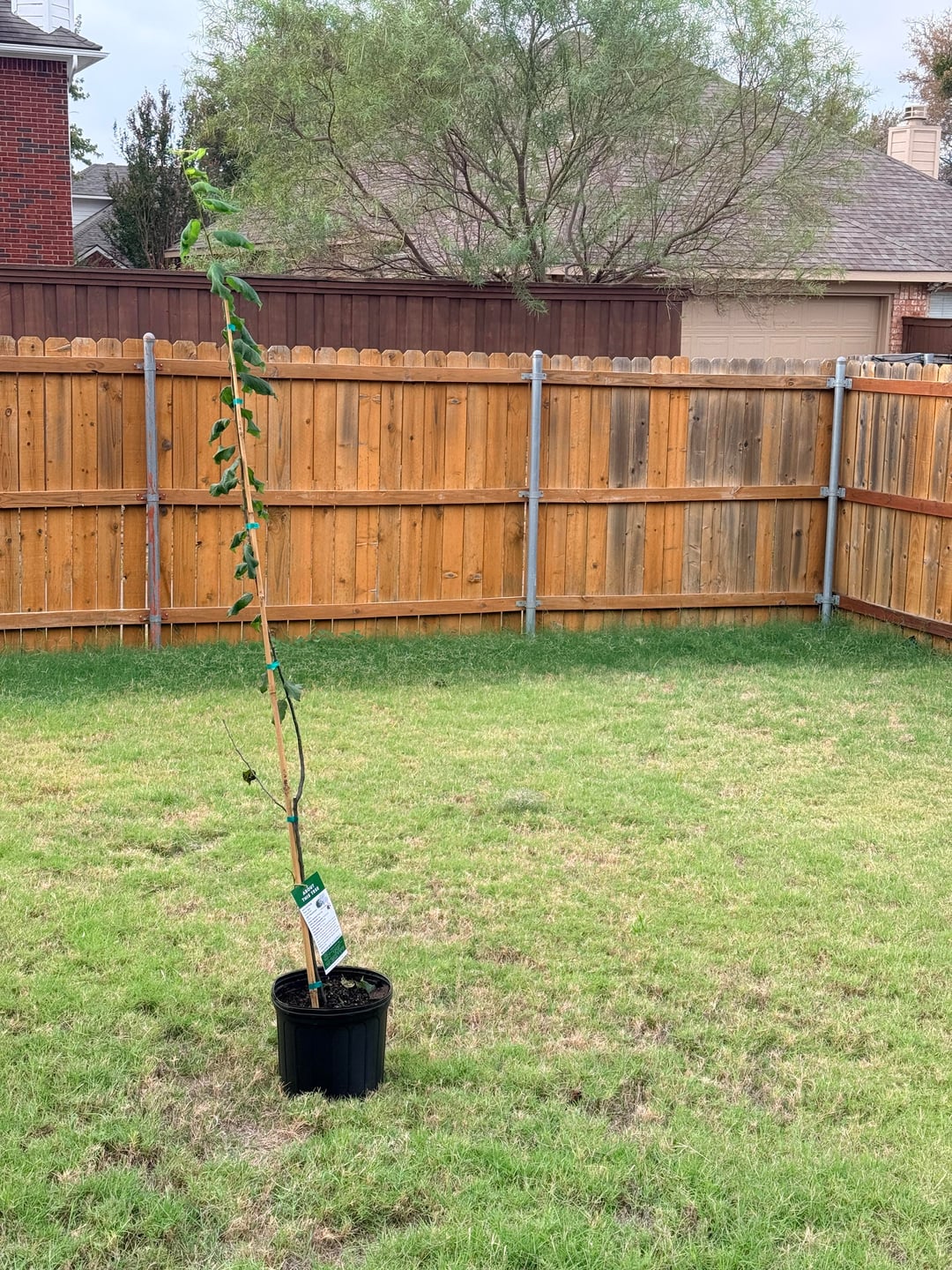 I’m planning on placing it in that corner there about ~5-10ft away from the fence. Other than stakes to keep the tree upright any advice on taking care of it. I’m slightly concerned about the health of the tree and the time of year is it to plant it. The leaves are a little curled as you can see in the photos.