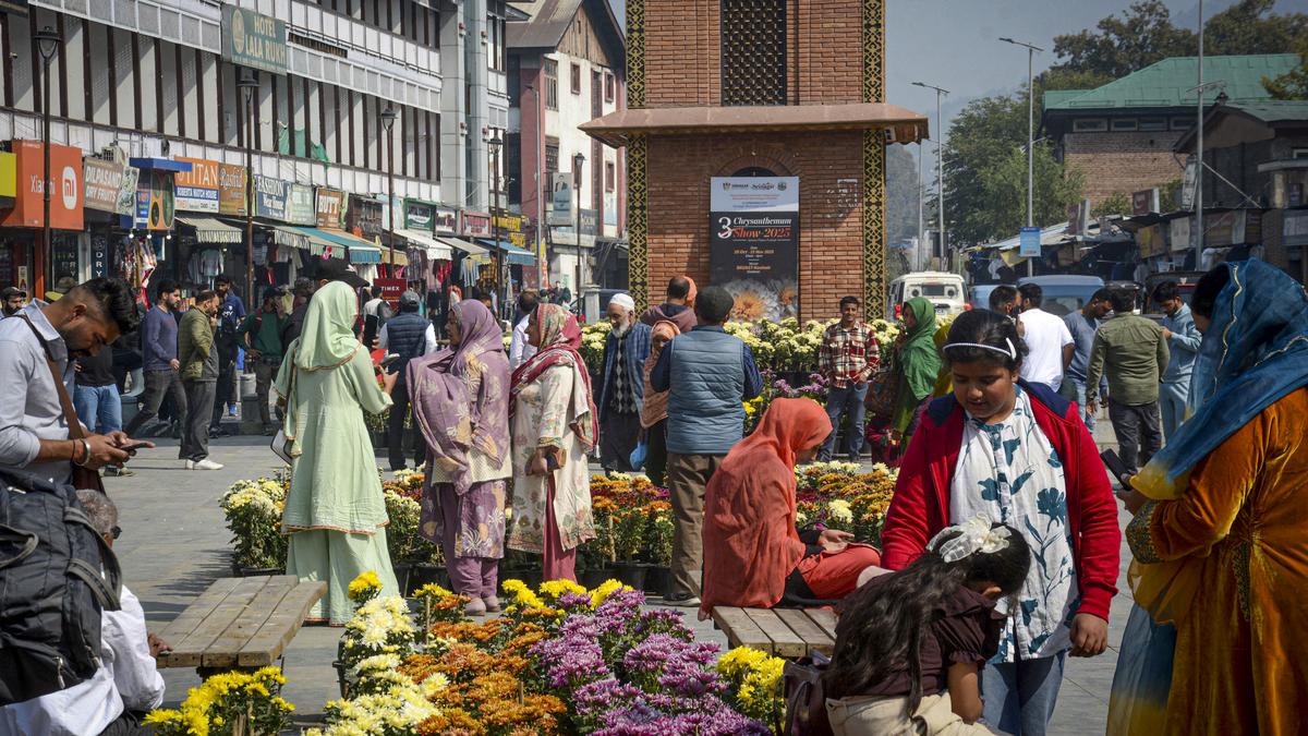 People during the Chrysanthemum Show 2025 at Lal Chowk, in Srinagar, on October 18, 2025.