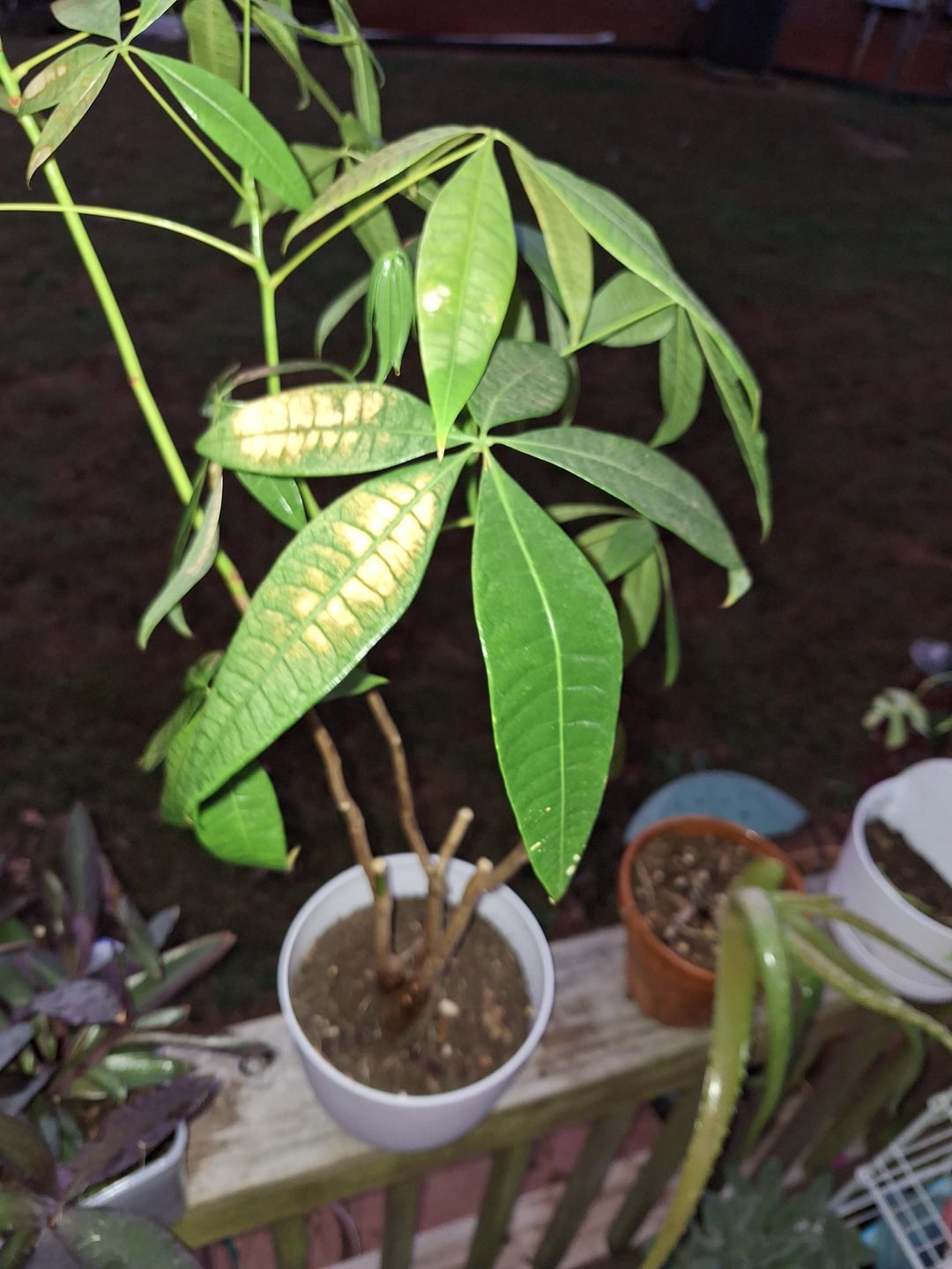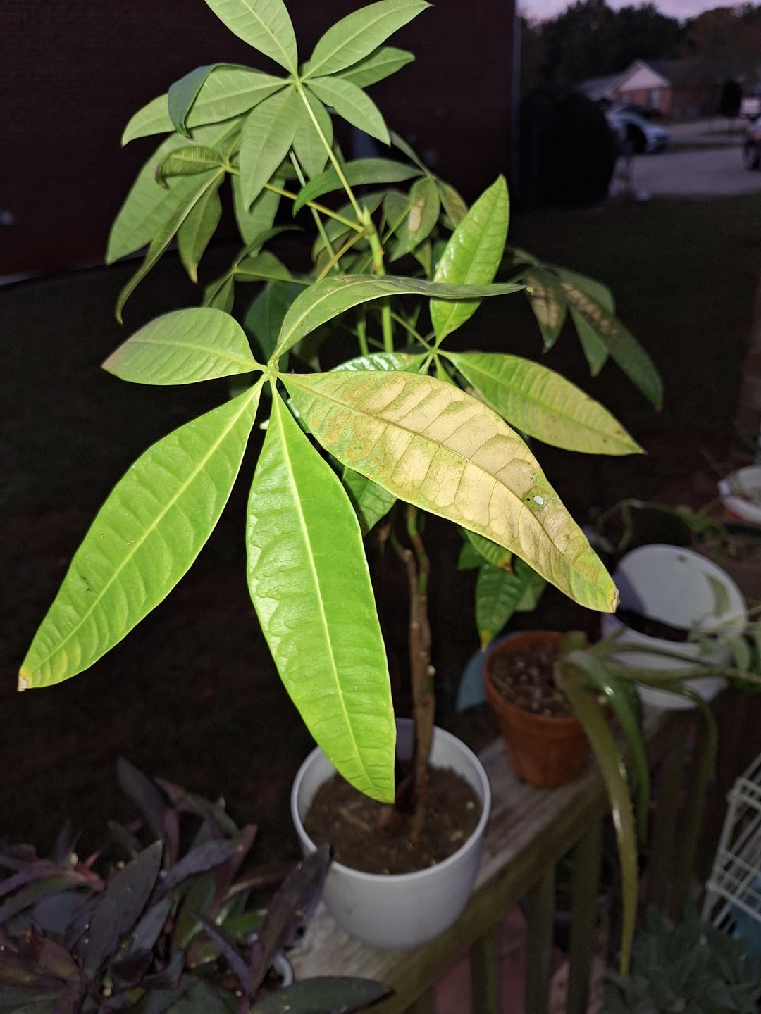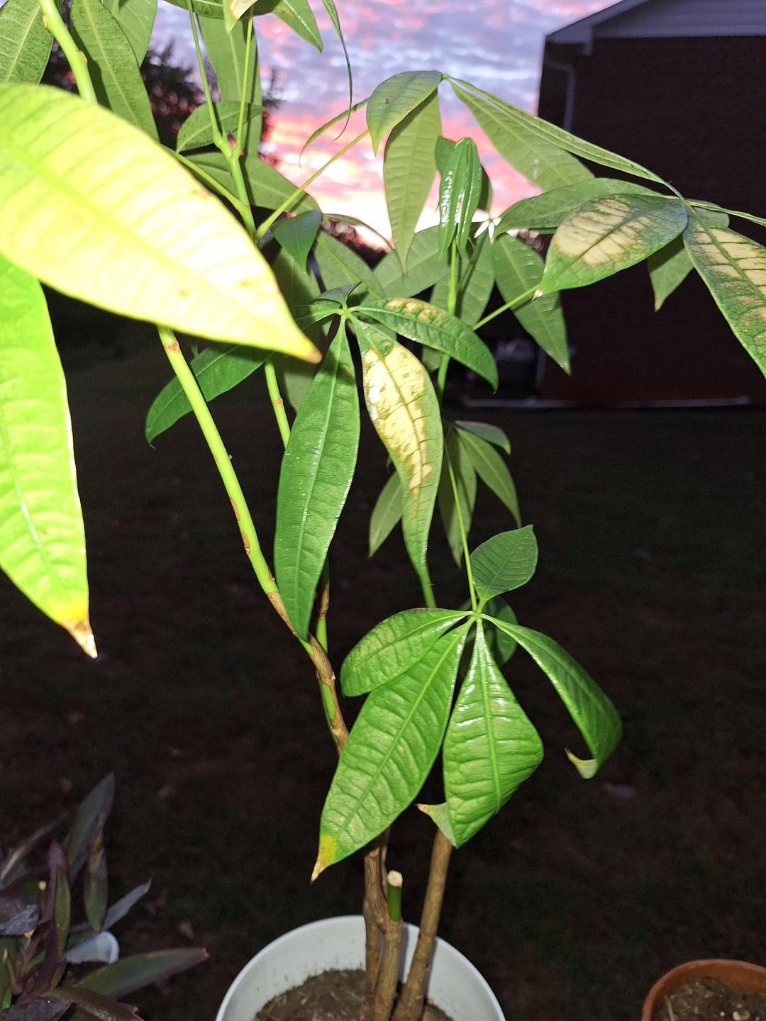 Pachira Aquatica. Loves being in shade or indoors, and only water once a week. Hardy plant.